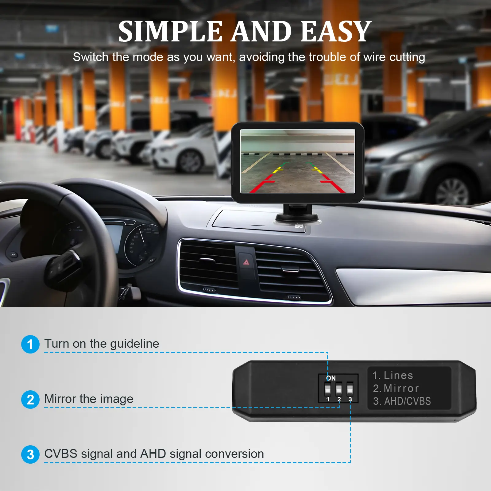 ·DIP Switch Control: By using dip switches to freely control signal changes(AHD or CVBS), giude lines(on and off), and image mirroring, it eliminates the trouble of cutting the wire,you can adjusted as needed at any time.