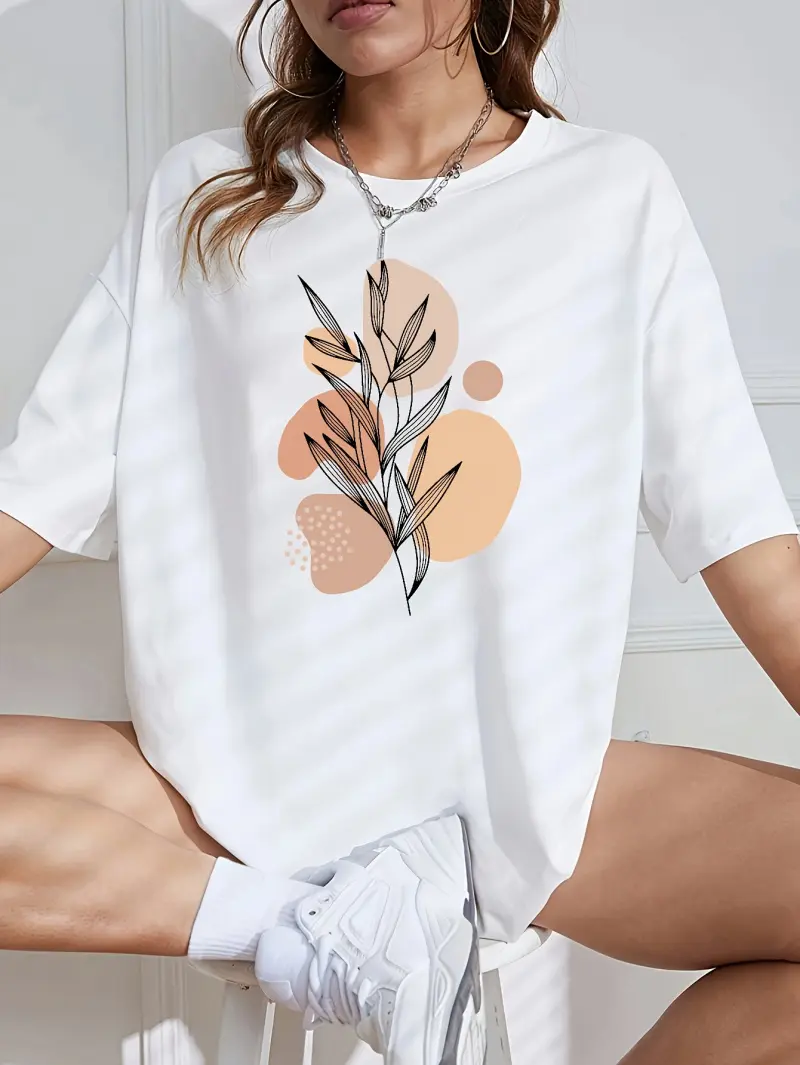 Simple Line Floral Pattern Color Block Print Round Neck T-Shirt, Oversized Loose Fit