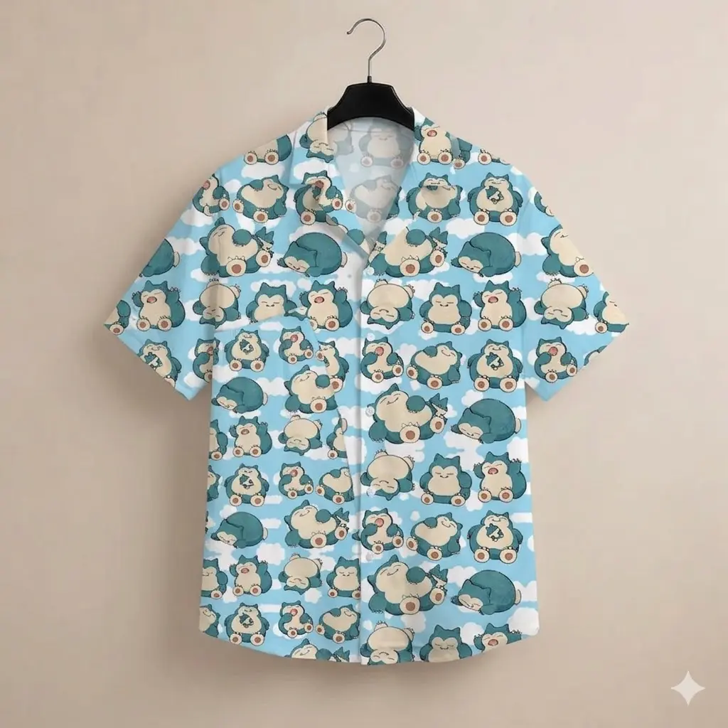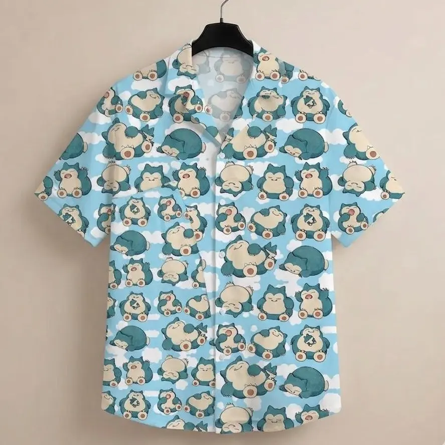 Snorlax Hawaiian Shirt, PKM Anime Button Up, Cute Tropical Summer Beach Shirt, Gift for Men Women