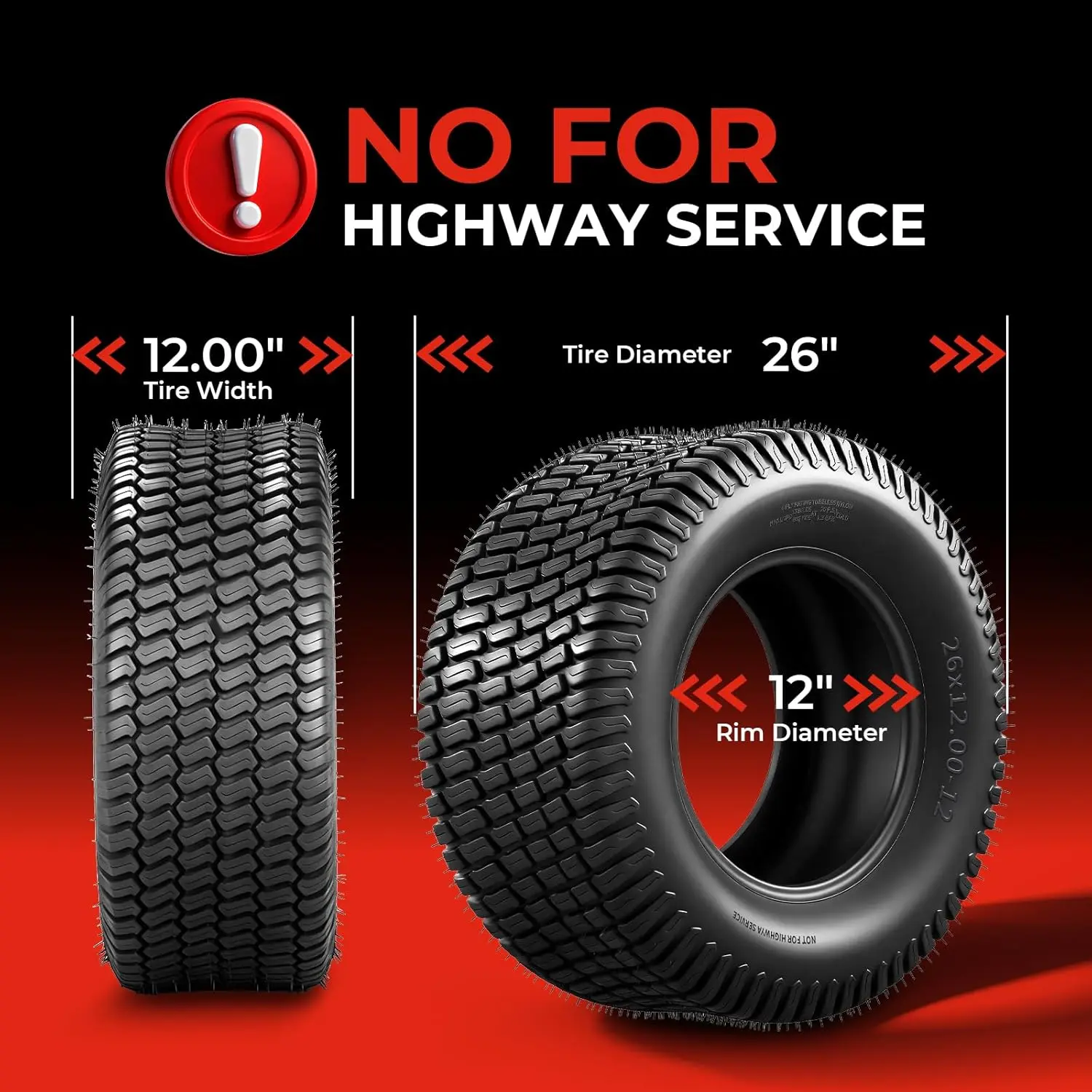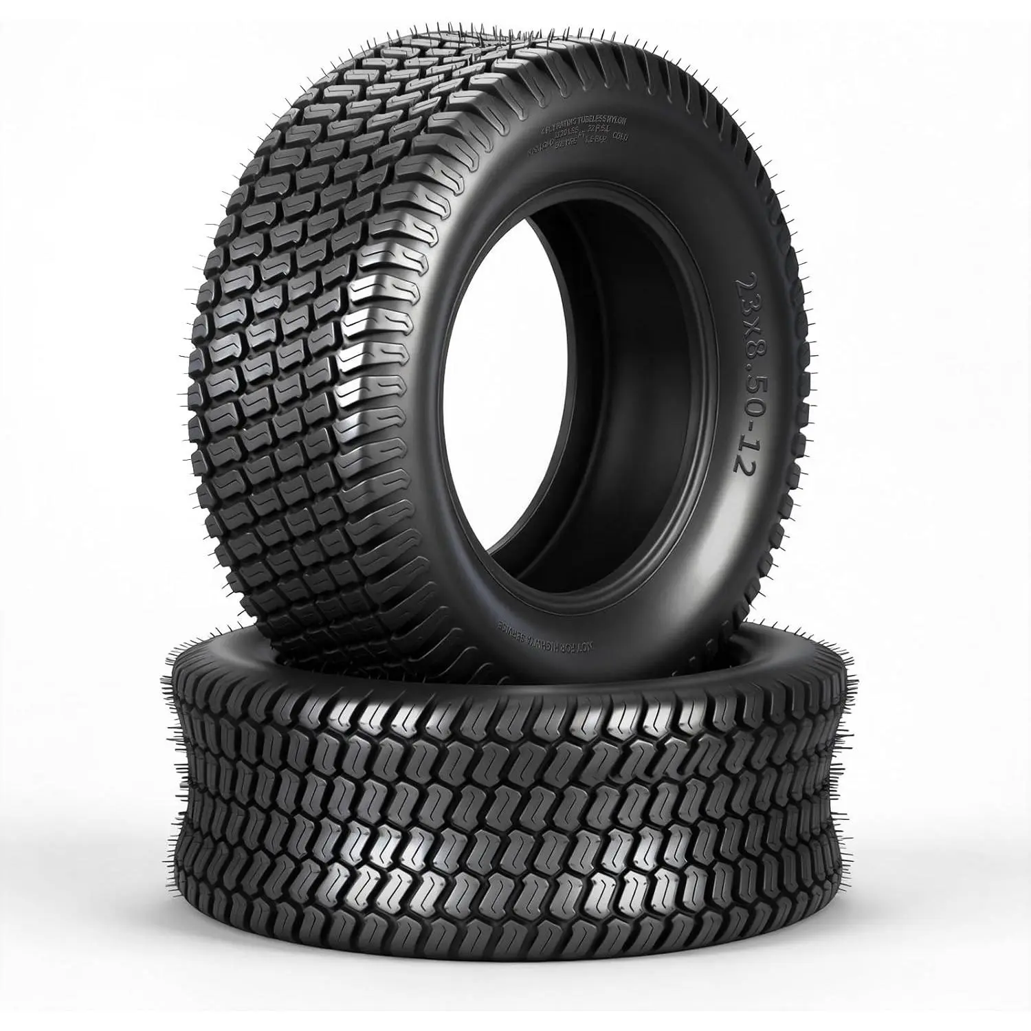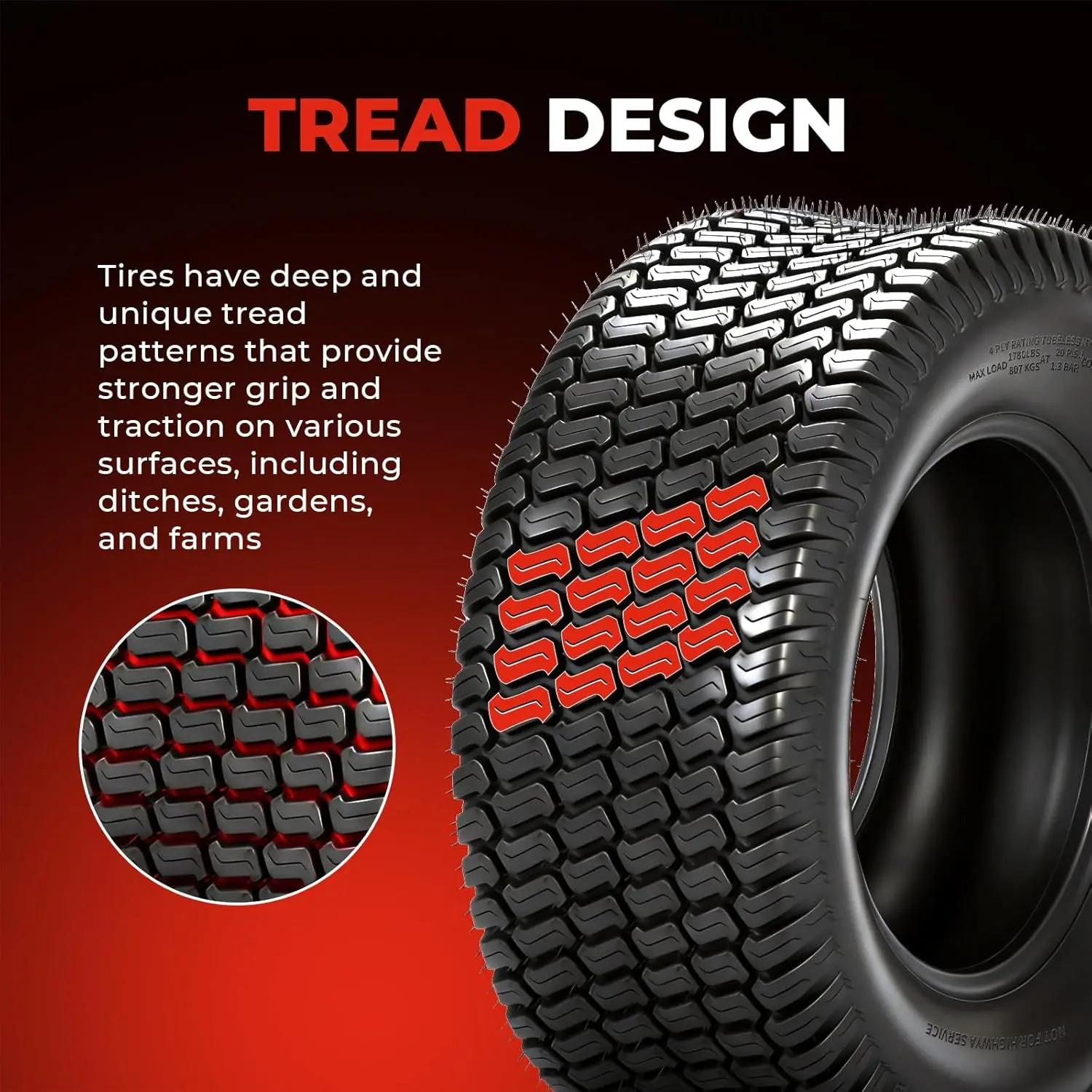 The 2 Pcs 15x6.00-6 Tubeless Turf Tires feature precise specifications tailored for optimal lawn and garden equipment performance, including a 4PR ply rating, 0.24in/6.1mm tread depth, 4.5in rim width, 6in rim diameter, 5.94in/151mm section width, and 14.17in/360mm overall diameter, supporting a max load of 572lbs at 30psi and complying with DOT R3 standards. Crafted with heavy-duty 4PR tubeless construction and high-quality rubber material, they deliver a smooth driving experience on lawns while boasting excellent puncture resistance, abrasion resistance, and anti-aging properties, ensuring long-lasting durability even with regular use. The wide shoulder and turf-friendly tread pattern not only provide superior traction and stability on various terrains—including grassland, wet grass, slopes, and hills—but also minimize damage to your lawn, prevent slipping, and reduce tire noise for a quieter operation. Widely compatible with most lawn mowers, riding mowers, garden tractors, golf carts, utility vehicles, farm equipment, and more, these versatile tubeless turf tires are an ideal replacement or upgrade for your outdoor machinery. Please note that tires are sold in a set of 2, rims are NOT included, and they are not suitable for highway service. To ensure a proper fit, please check your original tire and rim size before purchasing; a helpful tip is to place the tires in the sun for a while to soften them, which will facilitate easier installation.