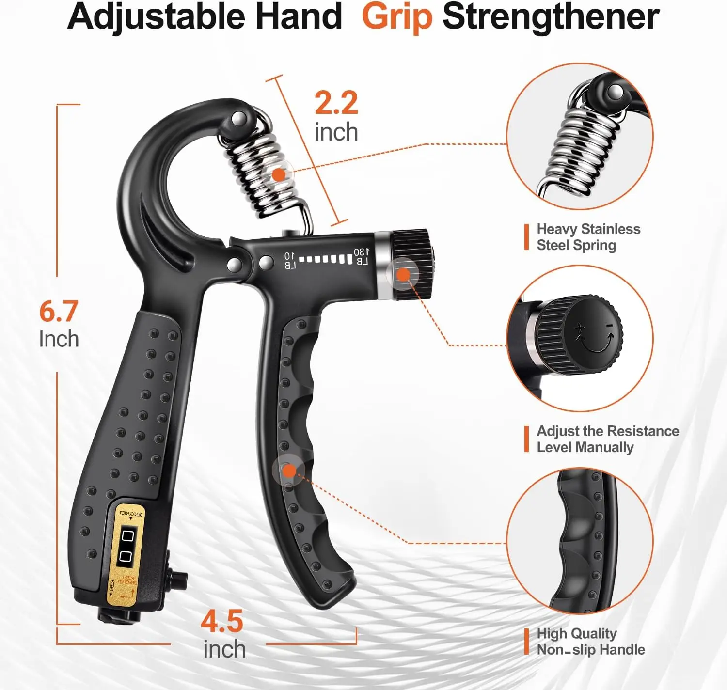 The Hand Grip Strengthener has a built-in counter to track your progress. Long press and turn the bottom button clockwise to clear the count. The hand grips can be adjusted for resistance from 10-130 pounds, suitable for men and women of all strengths.
