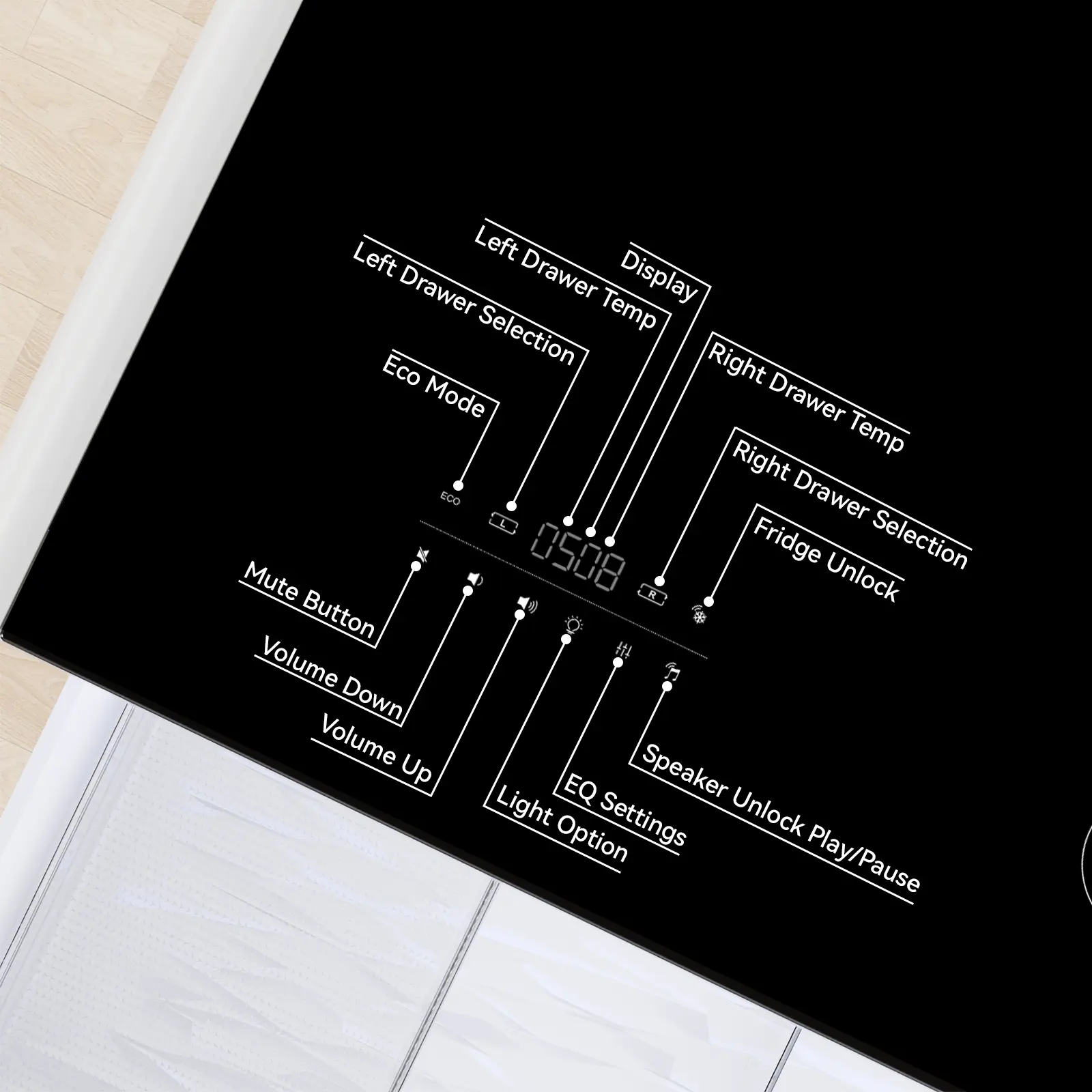 ·Dual-Zone Cooling & Freezing Drawers – Features two independently controlled drawers: a 65L refrigerator drawer (37.4°F–53.6°F) for beverages and snacks, and a 28L freezer drawer (-11.2°F–10.4°F) for ice cream or frozen foods. Keeps your favorites fresh and frozen, all in one sleek table.