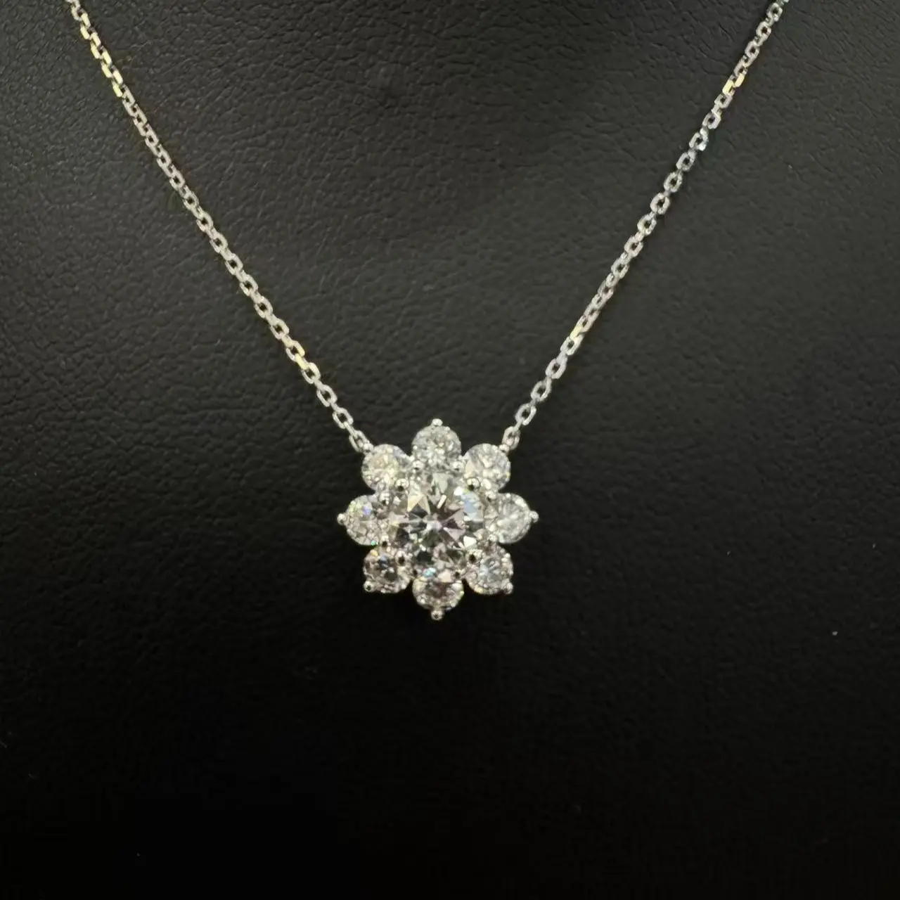 This stunning pendant features a round brilliant cut lab-grown diamond, weighing 0.5ct. Crafted in 18K white gold, it boasts a flower cluster halo setting that enhances its brilliance. Perfect for those who appreciate timeless elegance, this necklace is a versatile addition to any jewelry collection.