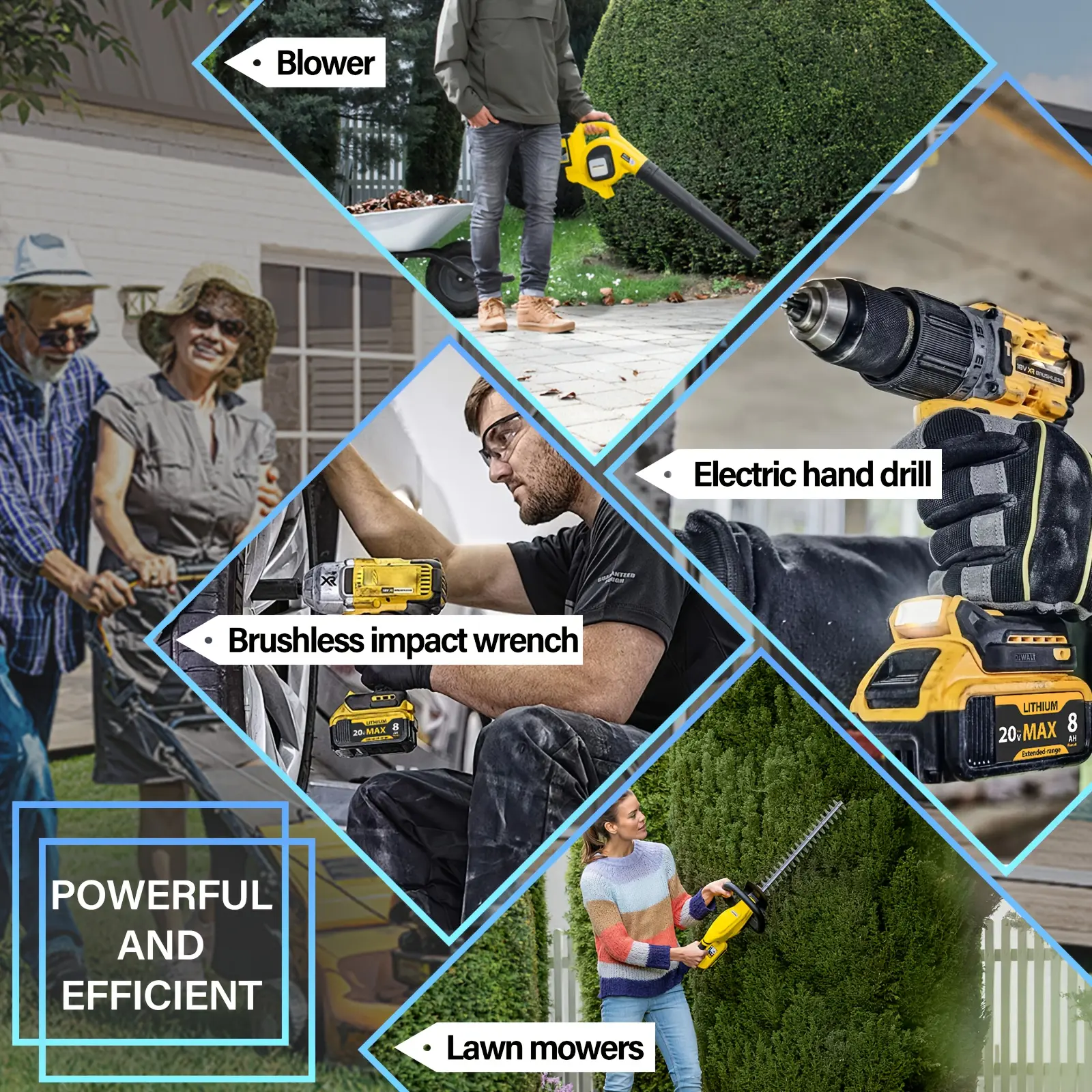 【High-Quality Replacement Battery for DeWalt】 Package Options: 6/4/2/1 Packs (meet your different needs) Core Parameters: 20V | 8000mAh (large capacity, stable power output) Wide Compatibility: Fit for DeWalt power tools & original batteries DCB200, DCB20 Premium Features: Long service life, safe charging & discharging, durable & reliable Ideal for: Professional contractors, DIY enthusiasts & daily household use