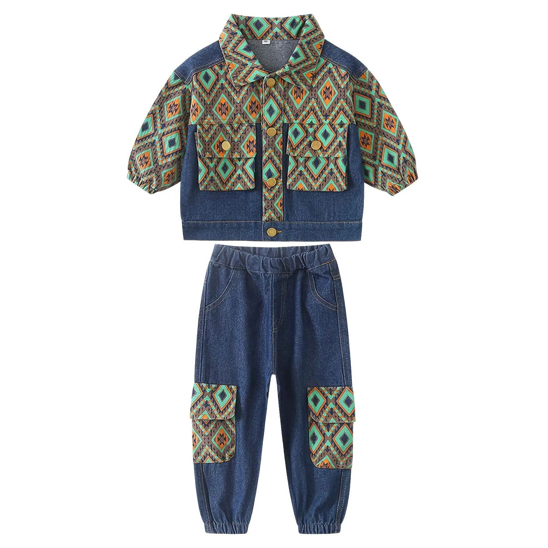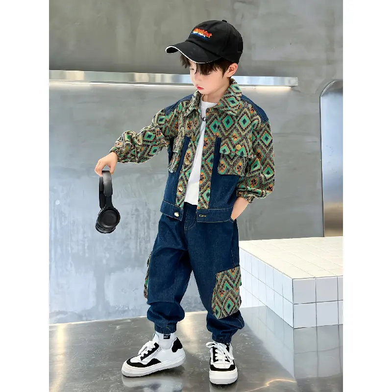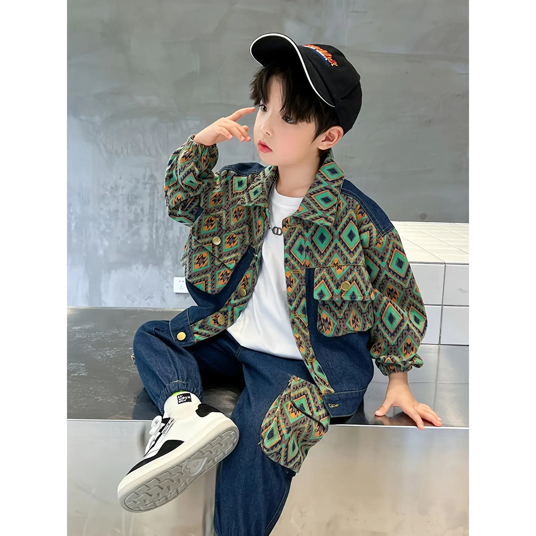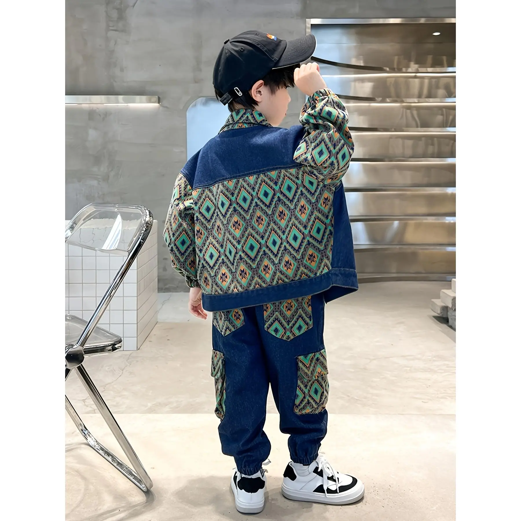 NewSuit Boys' Autumn Wear 2025 New Style Big Spring And Autumn Style Rogue Handsome Clothes Foreign Style Bohemian Style Fashion Suit Faux Denim Suit Two-Piece Set, for Outdoor