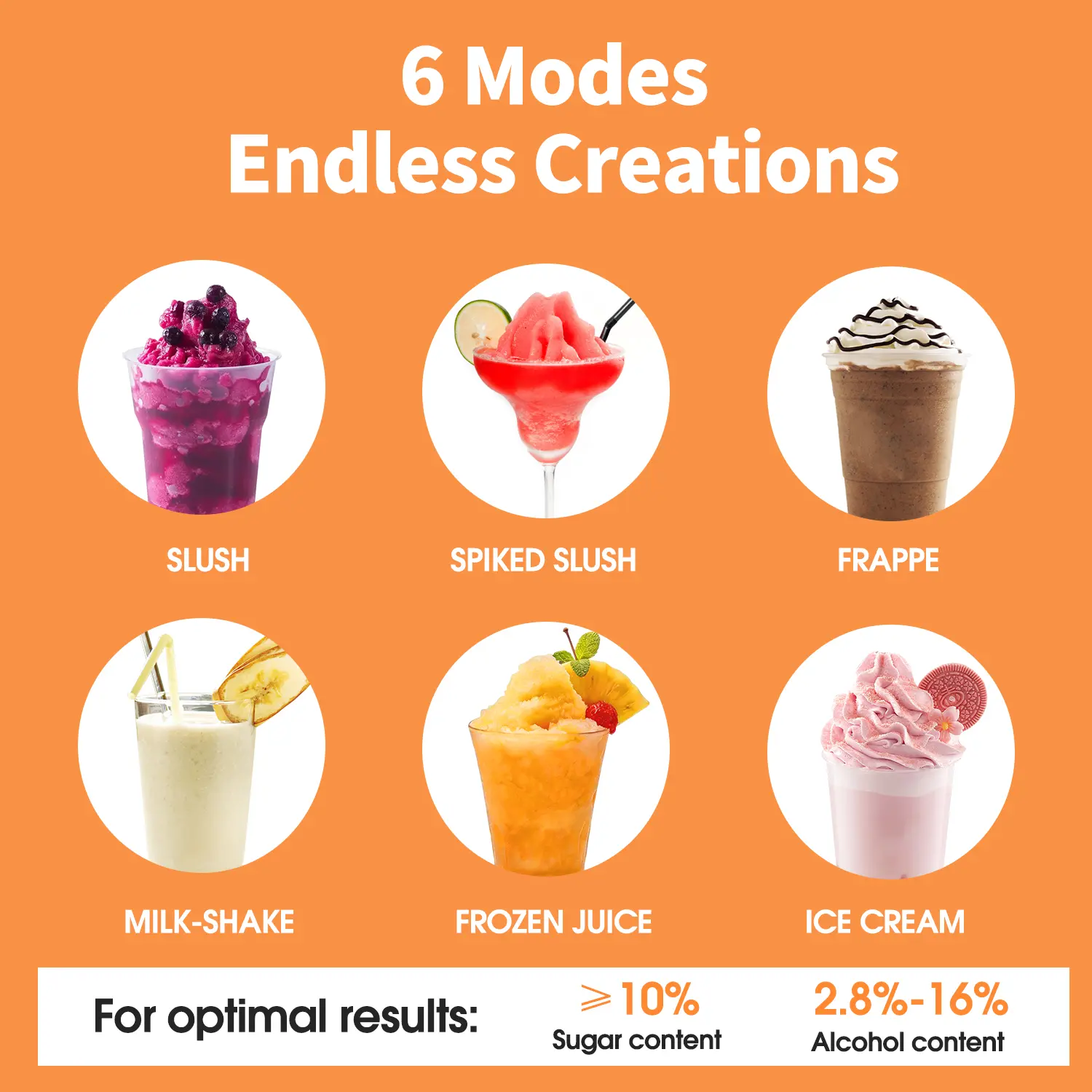 ·【6 Preset Modes】Comes with Slush, Spiked Slush, Frappe, Milkshake, Frozen Juice and Ice Cream modes, suitable for all frozen drinks like sweet beverages, alcoholic drinks and dairy-based drinks.