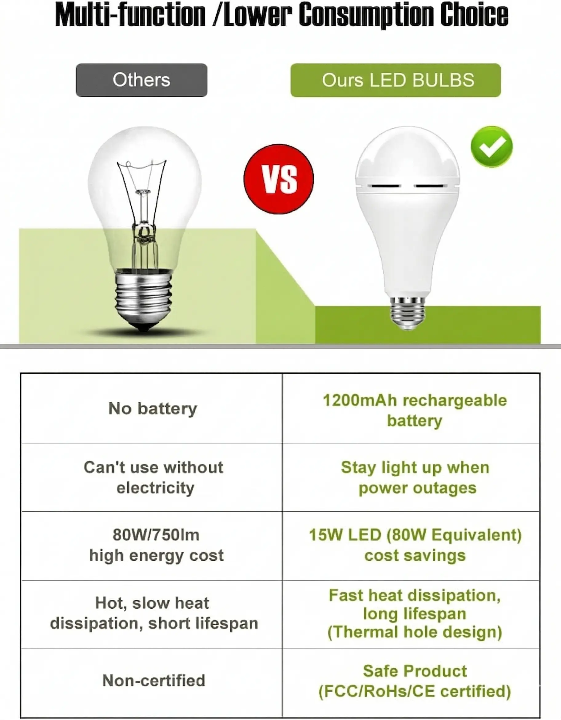 ·【Energy Efficient Light Bulbs】Provide 6000K white light and 750lm with low energy cost. Neporal 15W LED emergency rechargeable light bulbs is equivalent to 80W normal bulb. Save at least 80% electricity costs.