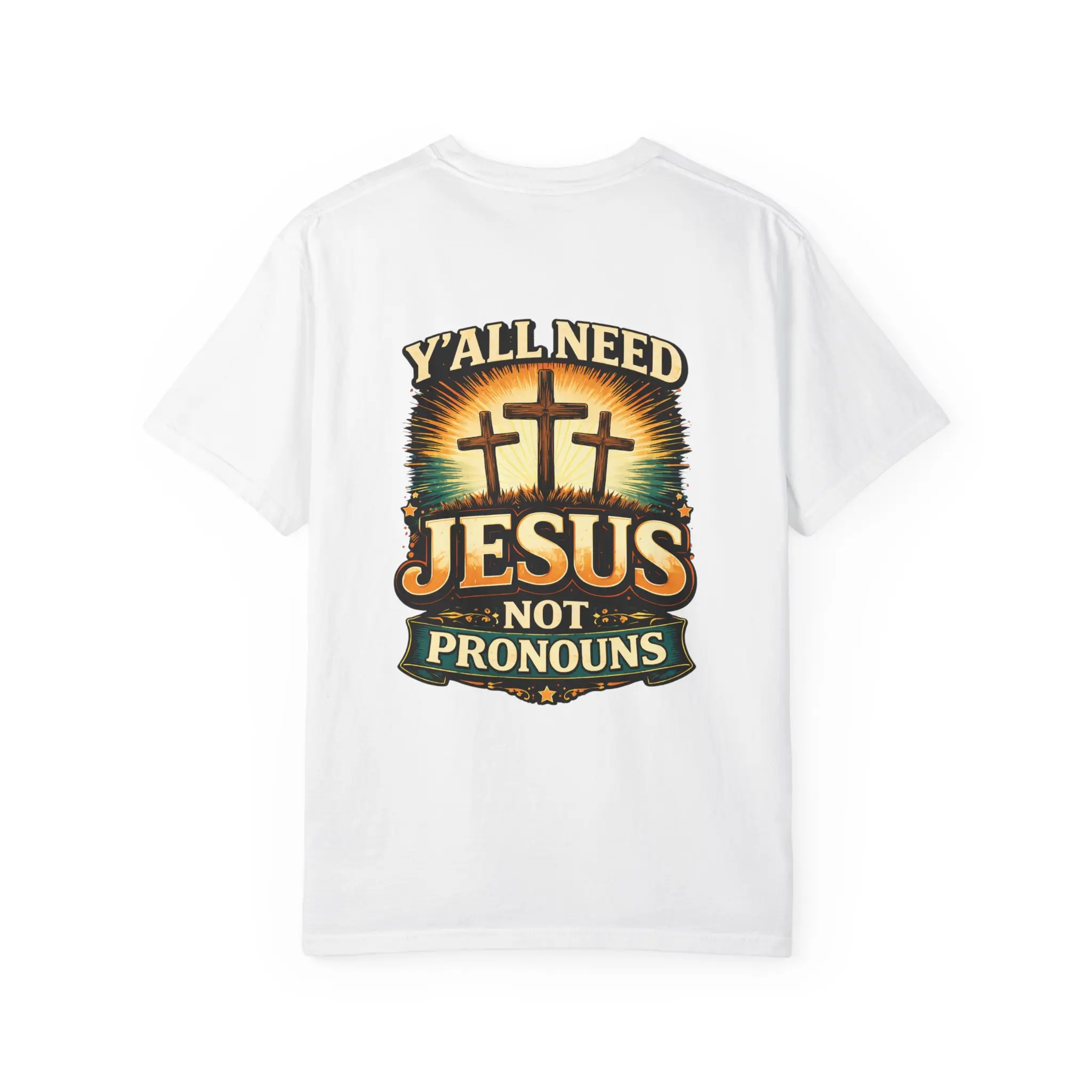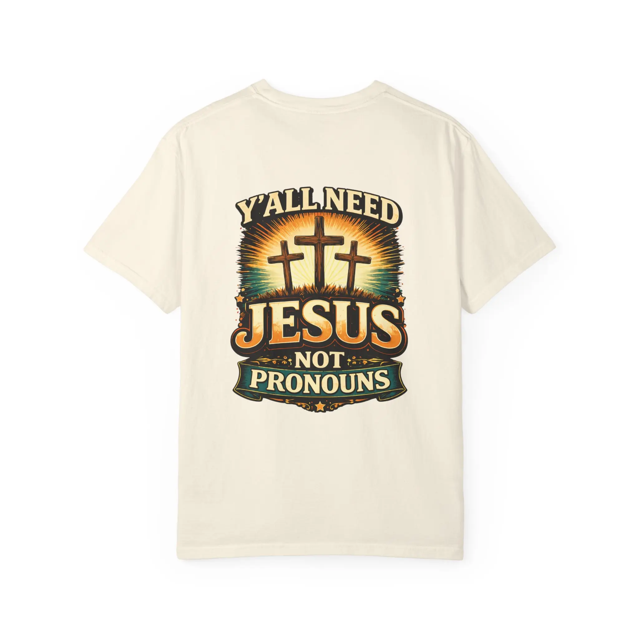 This heavyweight garment-dyed tee settles into your wardrobe like an old hymn—soft from the first wear, with a lived-in texture that only gets better. The front carries a subtle chest emblem while the back presents a bold, sunlit scene of three crosses and the words “Y’ALL NEED JESUS NOT PRONOUNS,” made to speak plainly and proudly. It drapes in a relaxed fit, feels sturdy yet breathable, and wears well layered under jackets or alone on warm mornings. Meant for folks who value clear faith-forward statements, it blends rustic Americana tones with durable construction so the message stays strong through wash after wash.