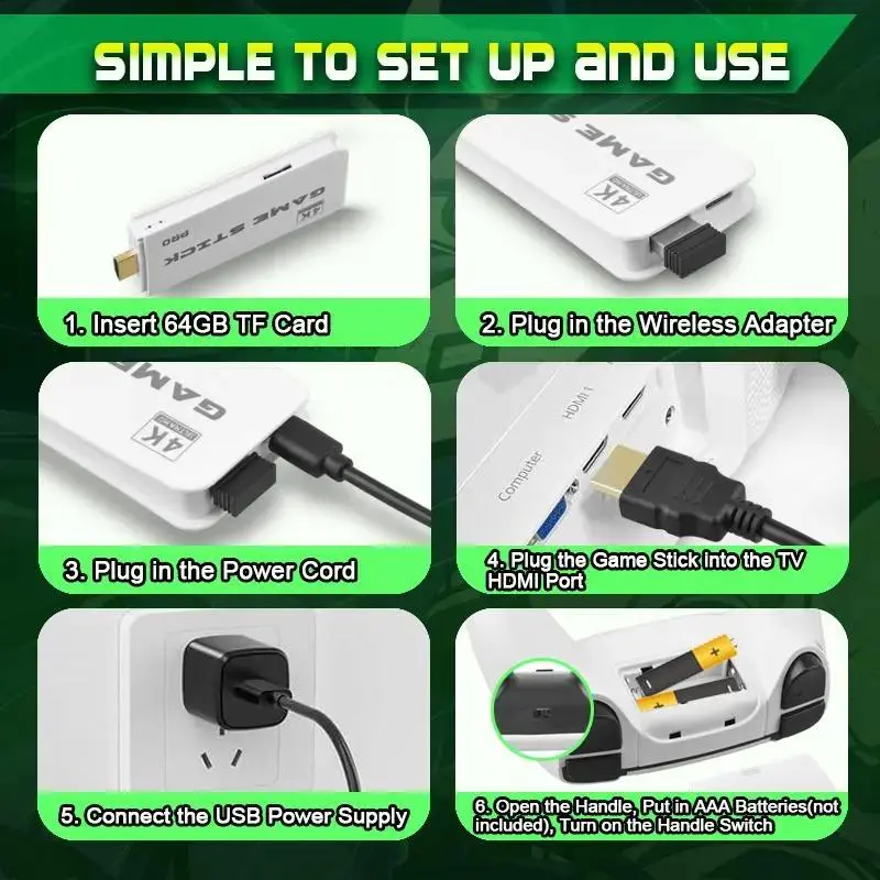 Experience high-definition pictures with 4K HDMI output and 2K1080P resolution. Equipped with an extended HDMI cable, suitable for various monitors. Connect to TV, computer, or PC for high-resolution gaming. Retro stick supports saving game progress.