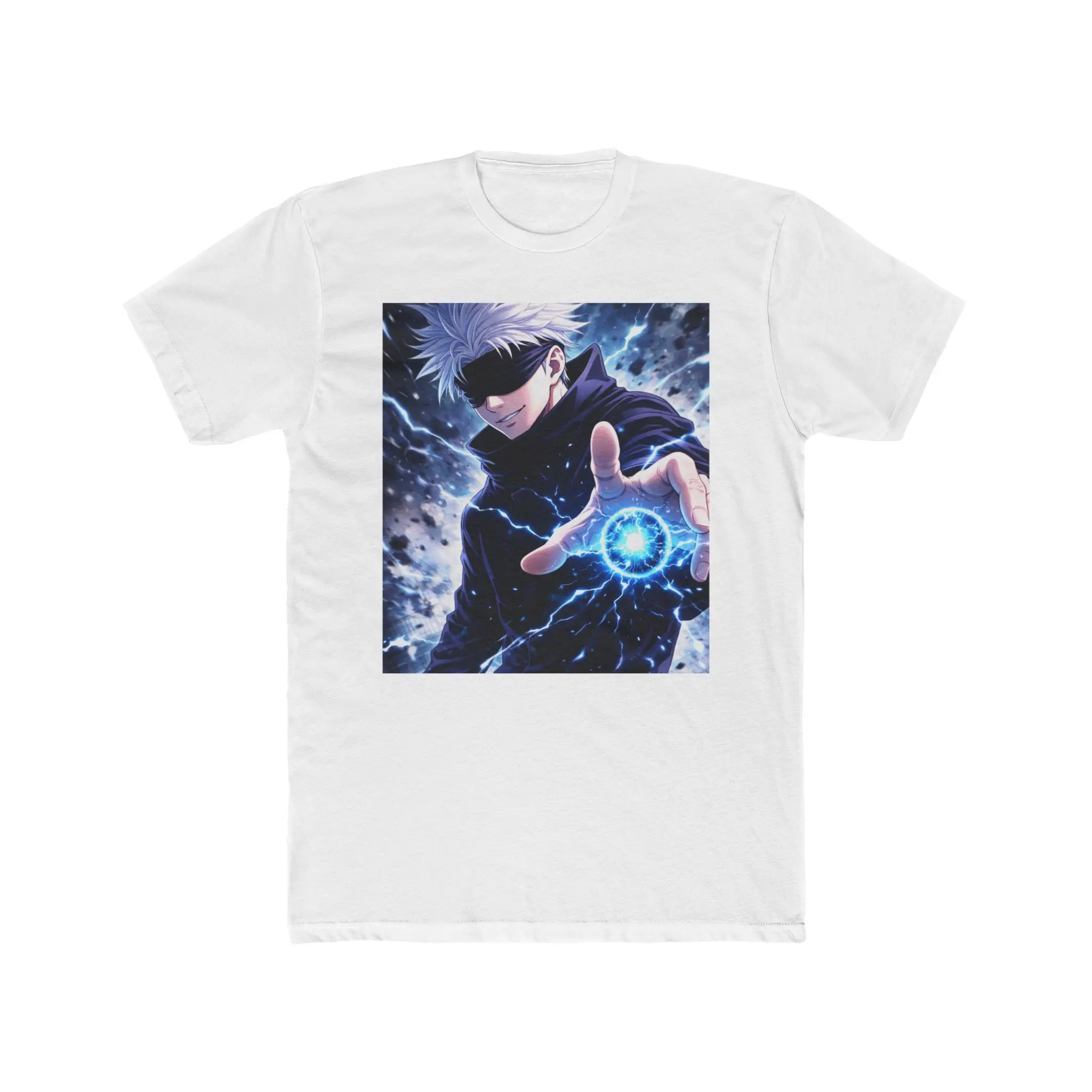 A lightweight cotton crew tee featuring a bold, high-energy anime graphic across the chest. The image captures a masked, silver-haired character conjuring a crackling blue orb — motion lines and electric textures give the print a dynamic, action-filled look. The shirt’s classic crew neckline and clean side seams keep the silhouette tidy, while shoulder tape helps the tee hold its shape through wear. Breathable fabric and a straightforward cut make it a wearable statement piece for fans who want to bring a dramatic, illustrated moment into everyday outfits or event wardrobes.