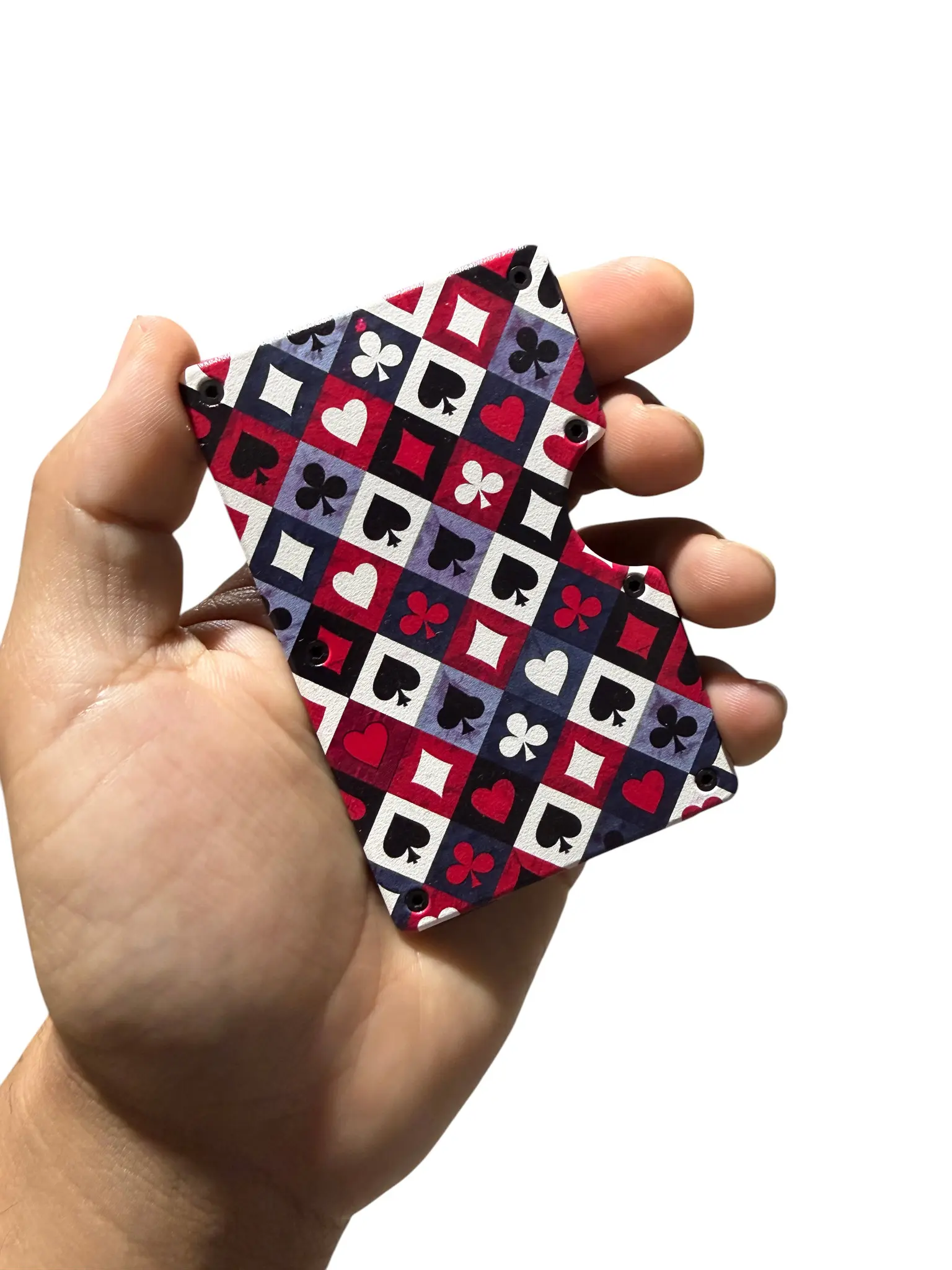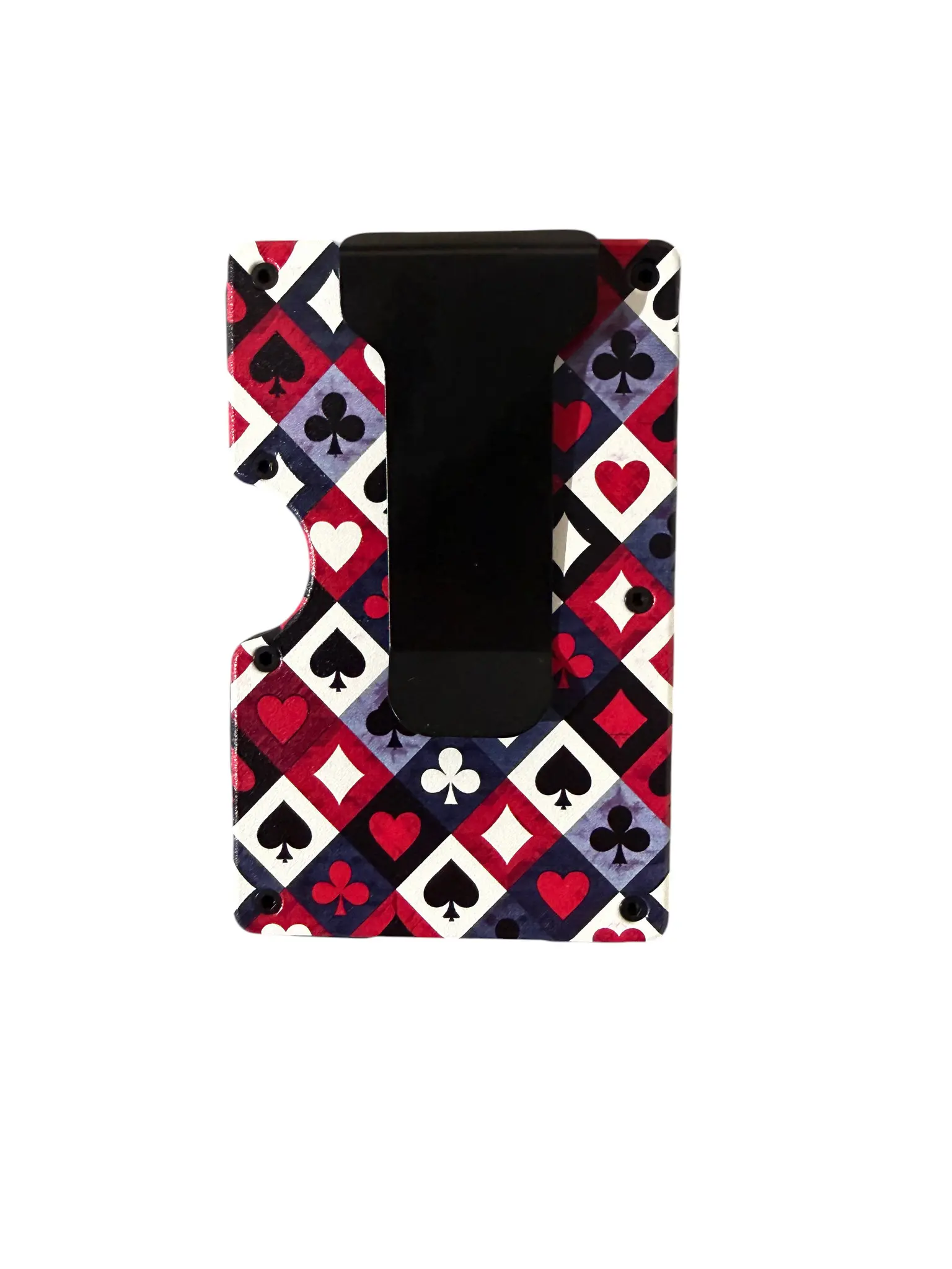 Bring a bold, casino-inspired look to your everyday carry. This slim aluminum wallet features a playing card suit pattern (hearts, spades, clubs, diamonds) with a clean, eye-catching design that stands out instantly.