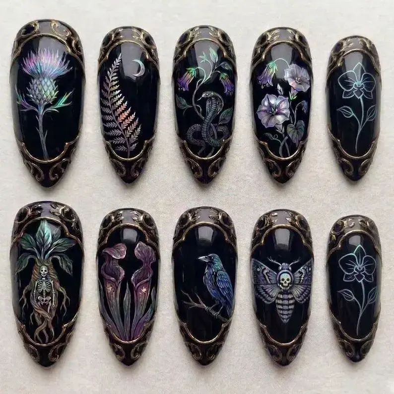 Gothic Botanical Press On Nails, Dark Witchy Nails with Snake Crow Moth, Handmade Black Nature Nails, Dark Academia Luxury Nails