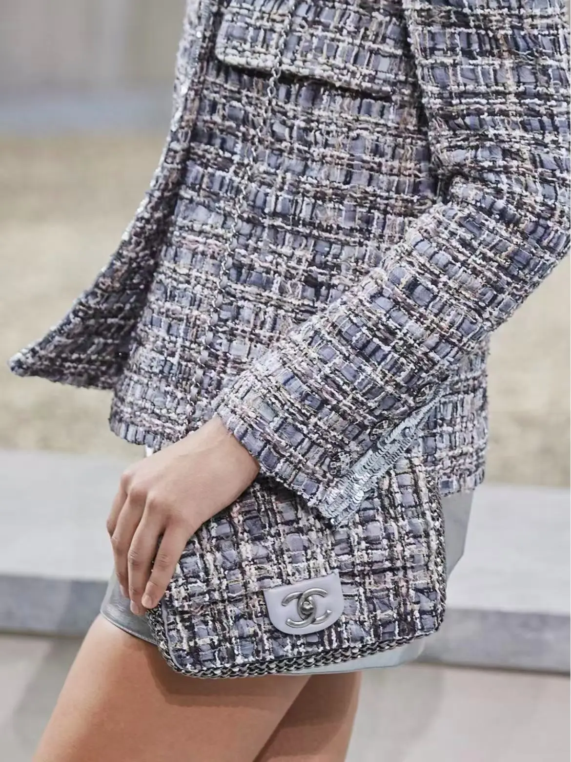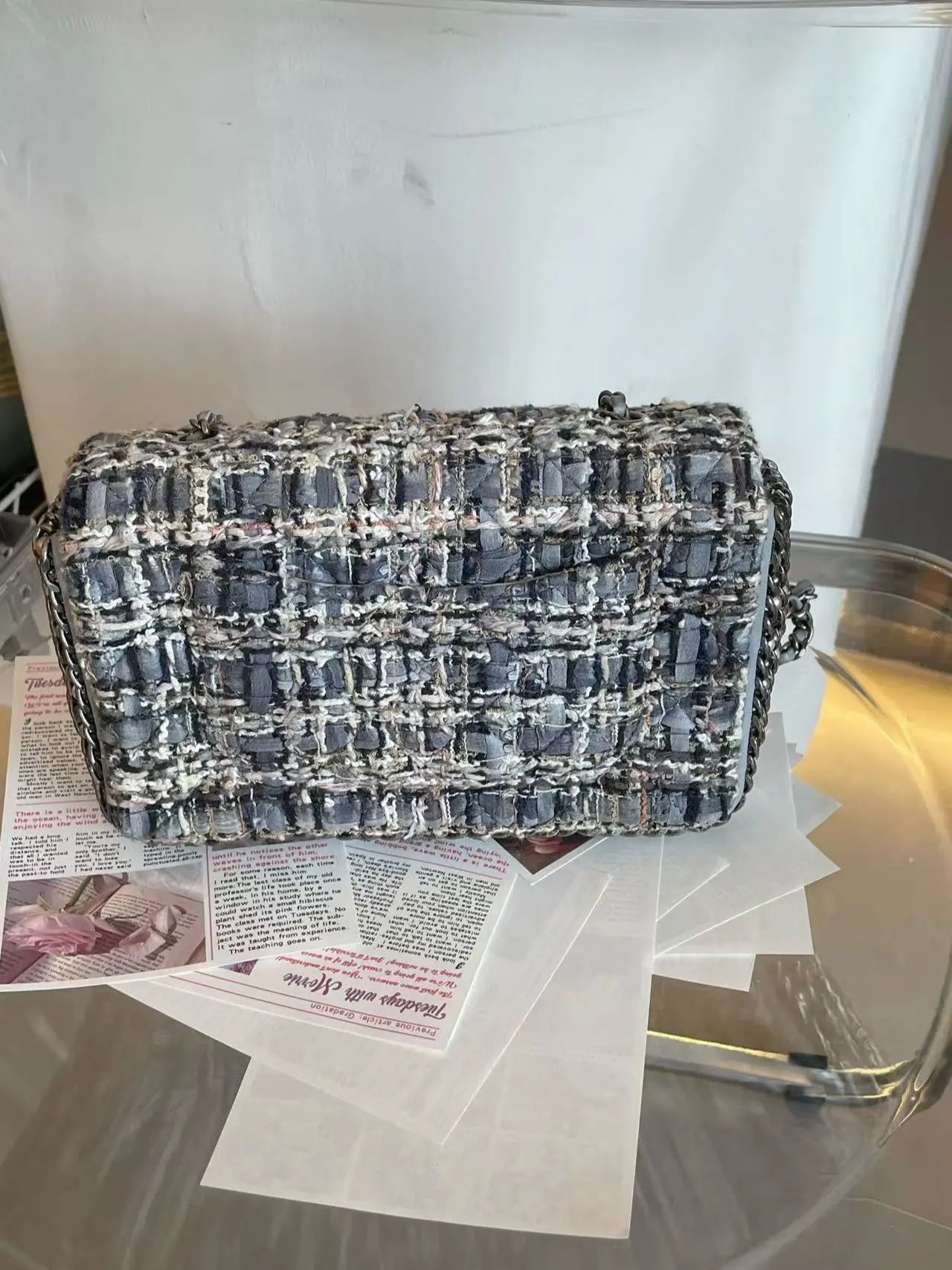 Pre-owned CHANEL Métiers d’Art Collection CF Mini Flap Bag (Large Mini / 30 Series, 2020) Blue Tweed with Houndstooth Pattern, Woven Trim & Pearl Details, Chain Strap, 98% New, 30 Series (Microchip Era)