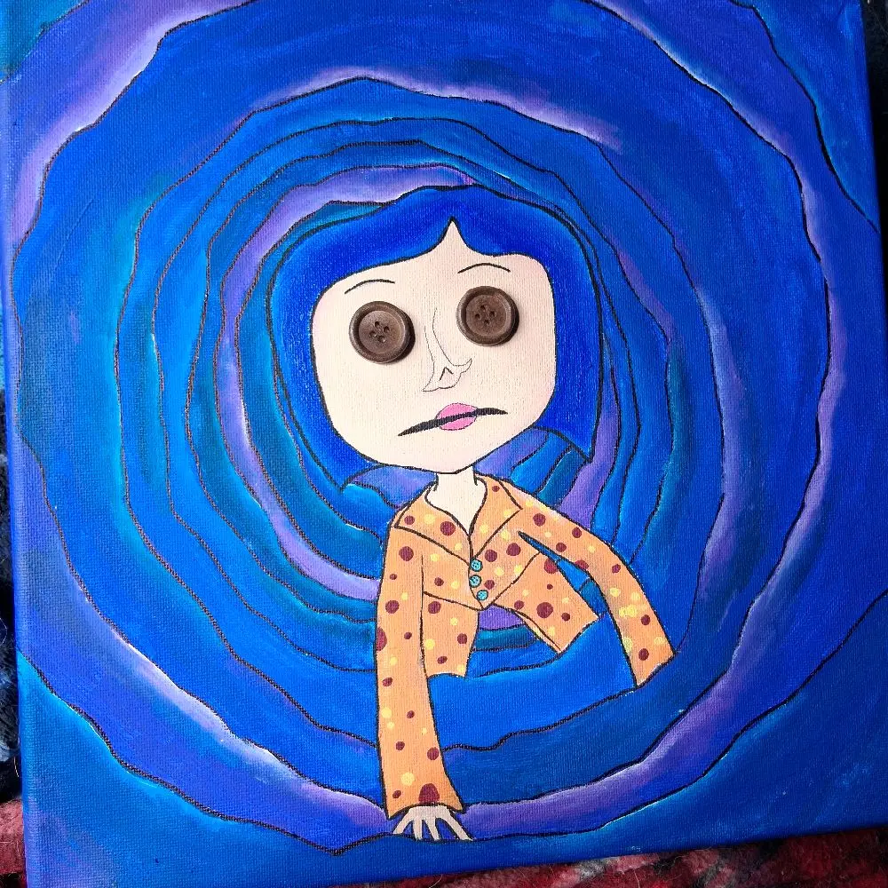 12"x12" canvas painting of Caroline with real buttons sewed into the eyes.