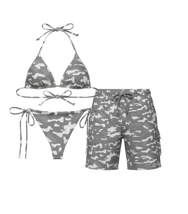 ✨ Elevate your summer style with this chic bikini set! The triangle tie swimwear and men’s drawstring beach shorts are perfect for a couple's vacation. The tan & white cheetah print adds a trendy flair. Ideal for sunny days by the sea, this set ensures you look and feel great.