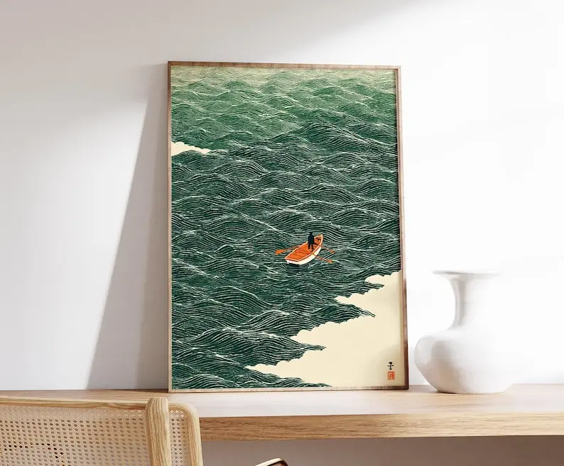 5. [SALE UP TO 50% + FREE SHIP]Japanese Wave Art, Boat at Sea Print, Minimalist Ocean Poster, Traditional Style Wall Art