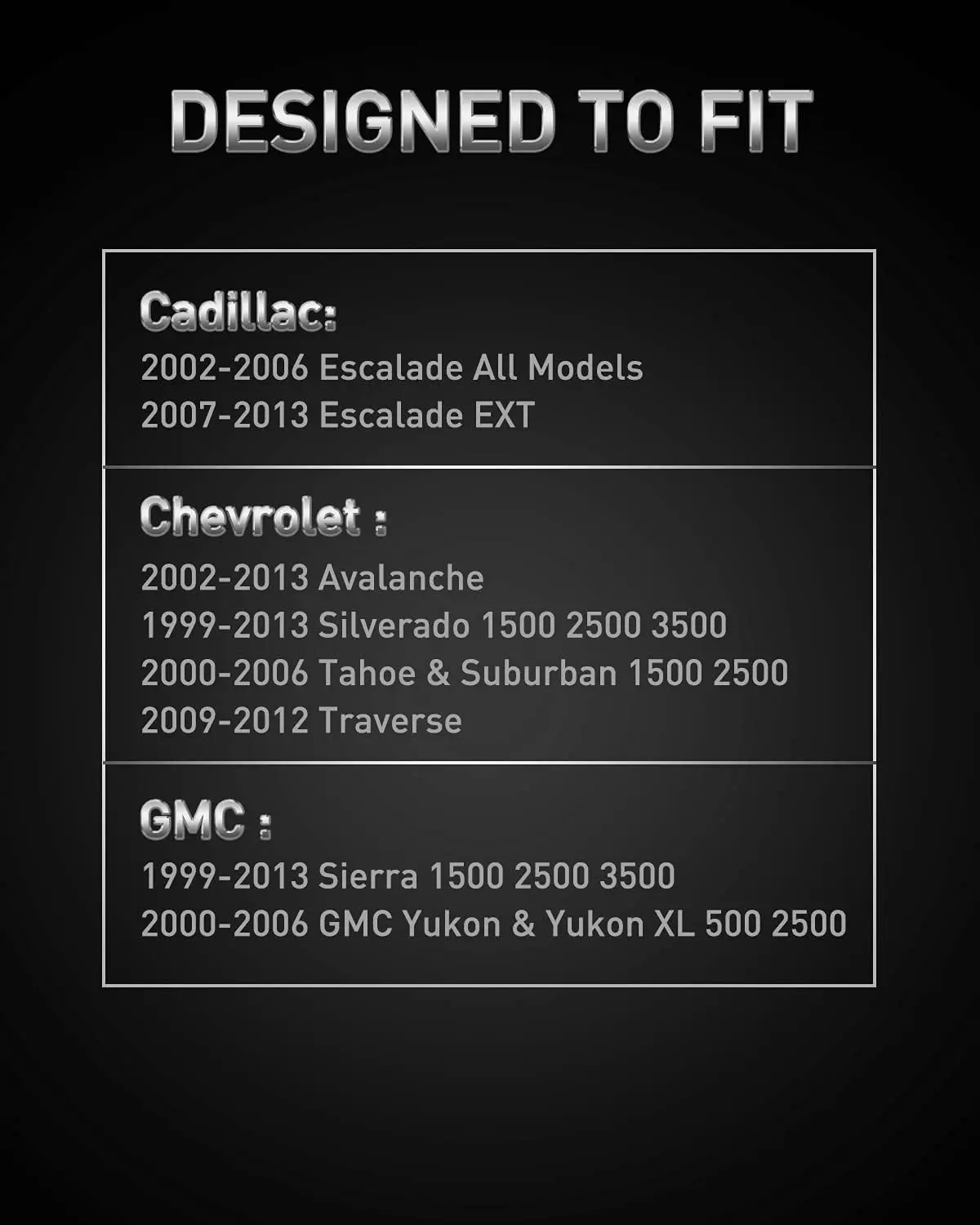 [COMPATIBILITY]: Fits a wide range of Chevy and GMC models including Silverado 1500, 2500, 3500, Suburban, Tahoe, Avalanche, Sierra, Yukon, and Escalade. (Refer to product description for full list of compatible models.)