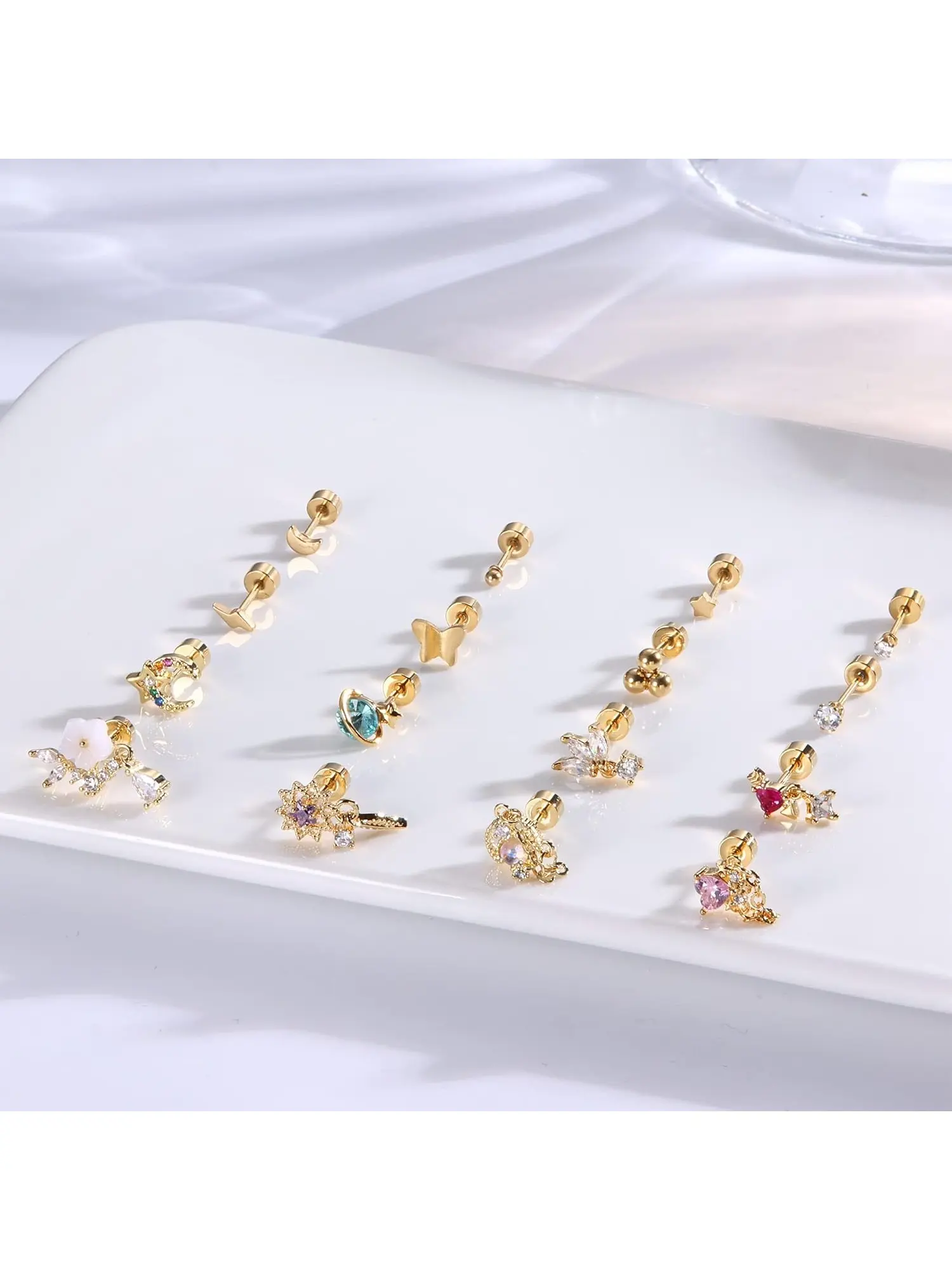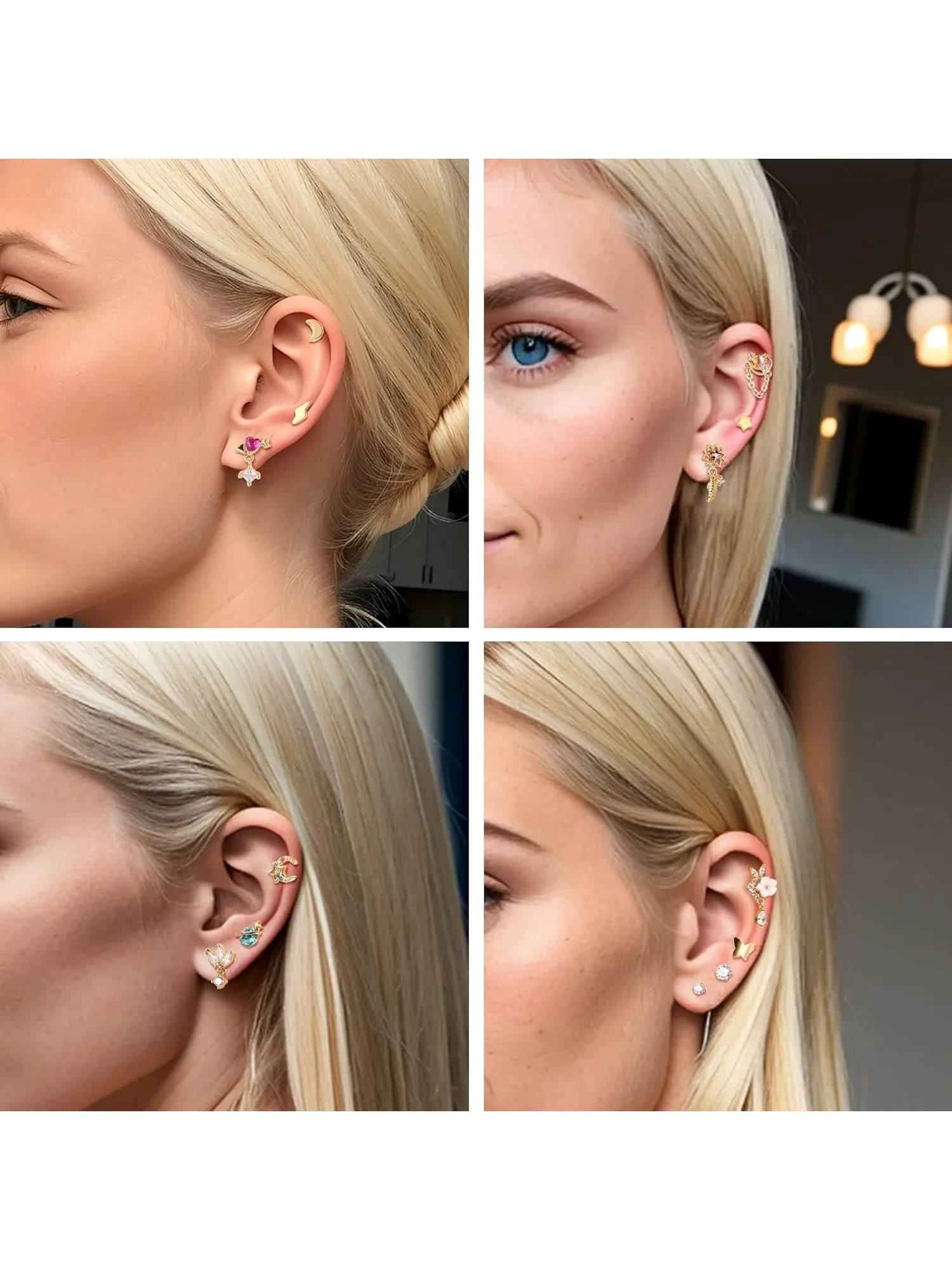 PAVOI 14K Gold Plated Pair of Flat Back Stud Earrings for Women - Dainty Helix Cartilage Piercing Jewelry - North Star Cluster Sparkle Heart Butterfly Moon Snake Smiley Bumble Bee Rose Flower Clover Flatback Stud Earrings
