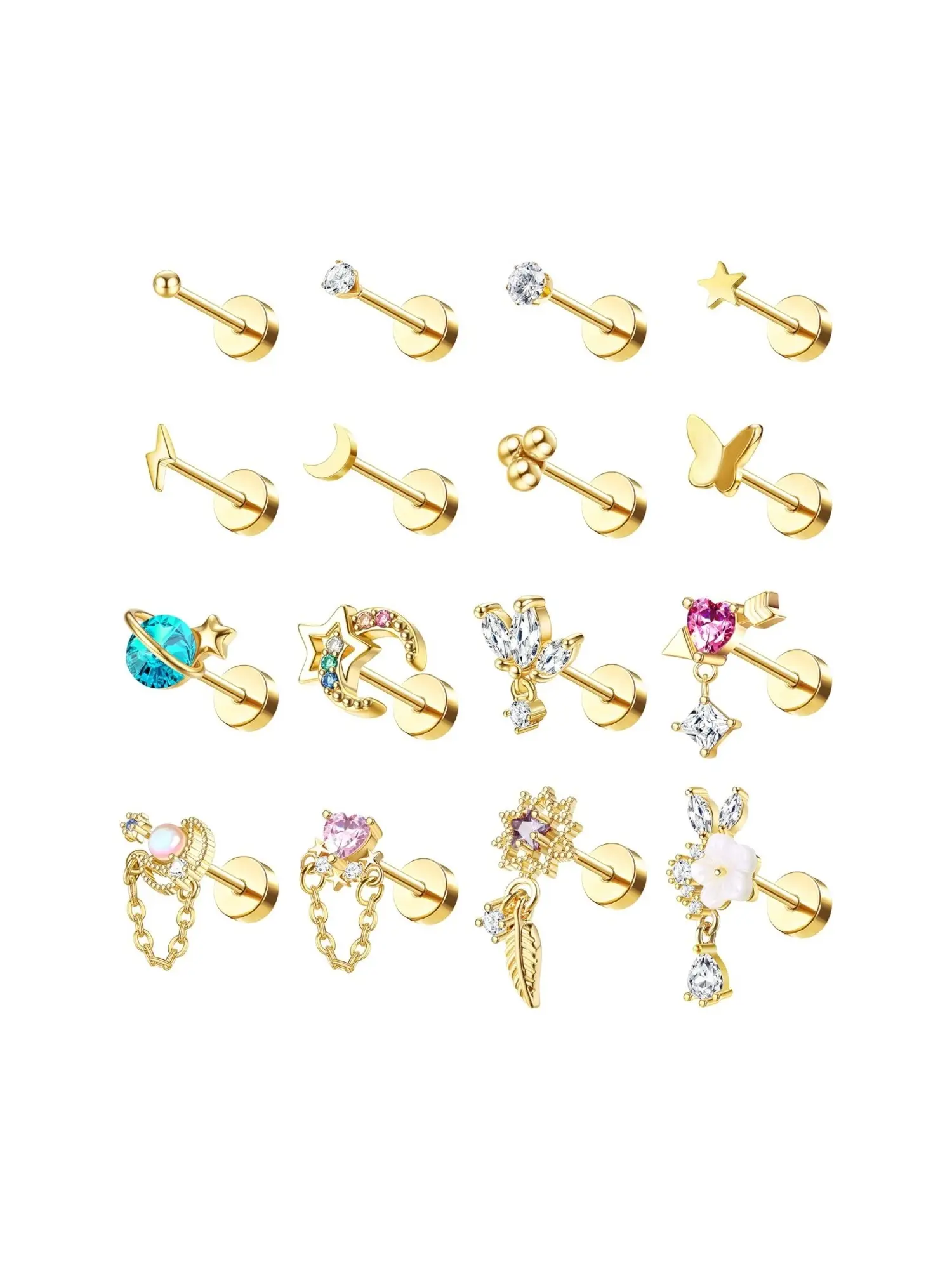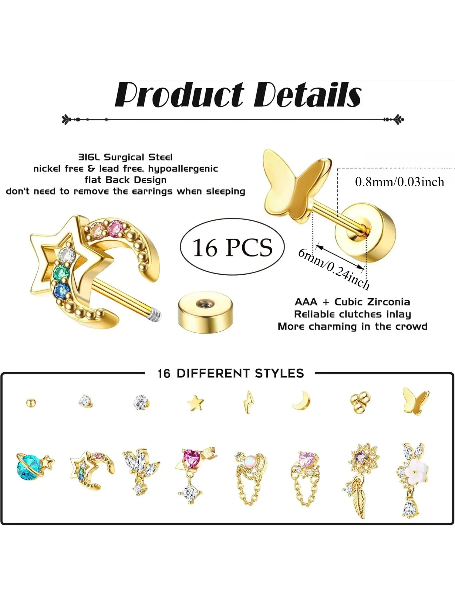 16 PCS Cartilage Flat Back Stud Earrings for Women Trendy Stud Earrings Set for Multiple Piercing Surgical Steel FlatBack Earrings for Women 20G