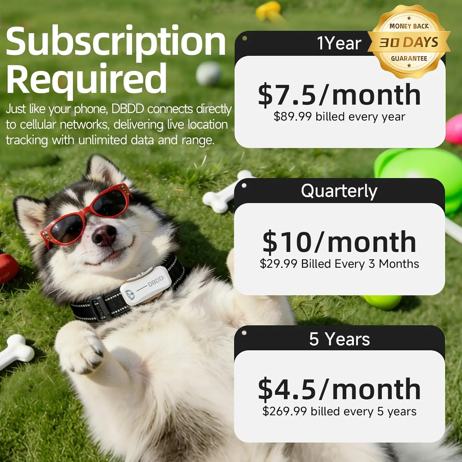 ·Subscription Plan Needed: The Subscription provides quarterly, 1 year package, 5 years package, starting from $4.5 /month (varies depending on subscription plan) for each tracker. No other hidden costs. The dog tracker works for Apple IOS products and Android