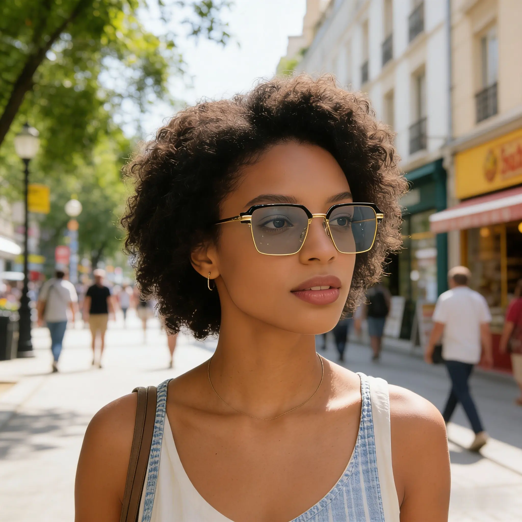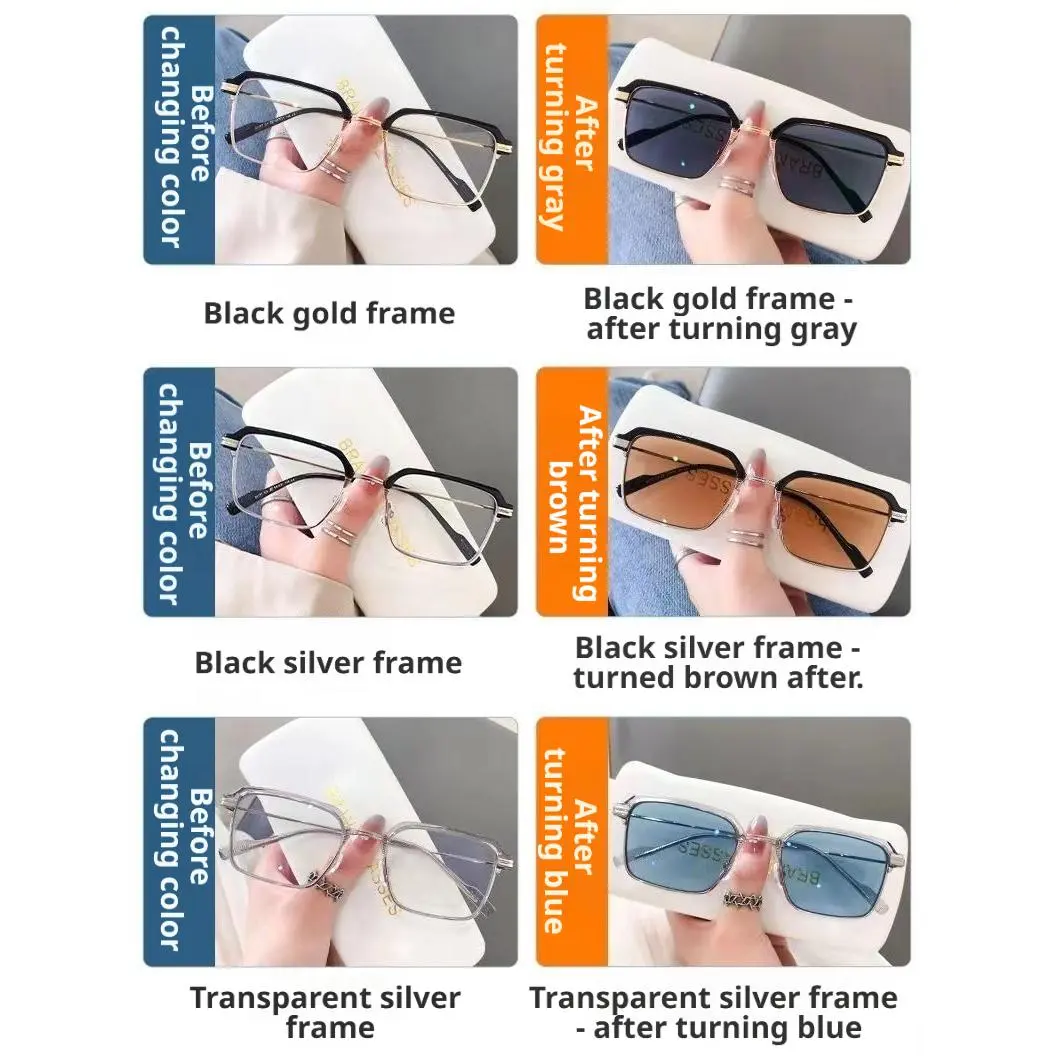 ·Lens tint effects: TurnsGrey / Tea Brown / Blue(choose when ordering)💎 Lightweight& Comfortable: Metal frame weighs only ~16g, with silicone nose pads and curved temples for all-day comfort.