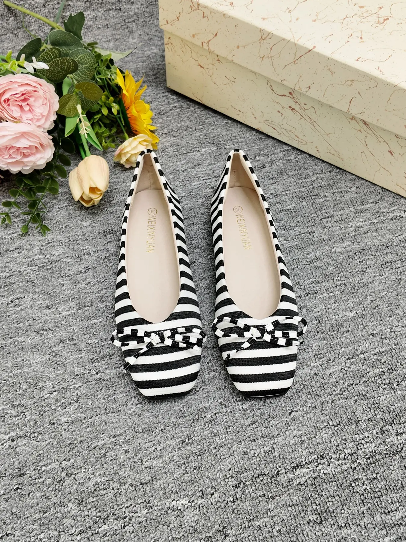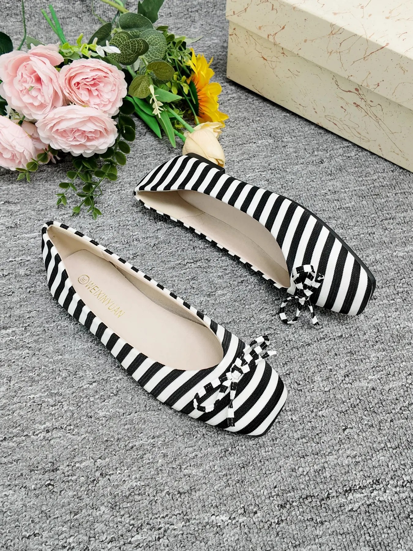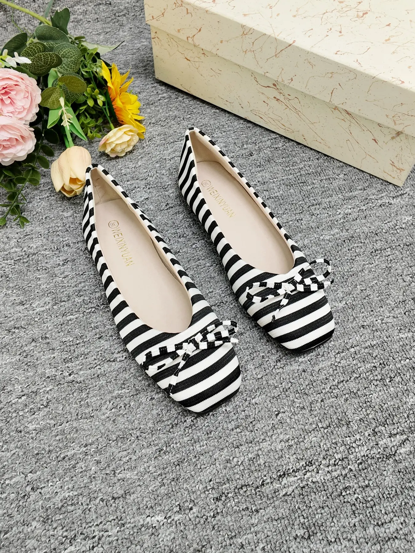 2026 New Striped Square Toe Flat Shoes, French Soft Sole Low Top Bow Single Shoe, Commuter Versatile Slimming Women's Shoes