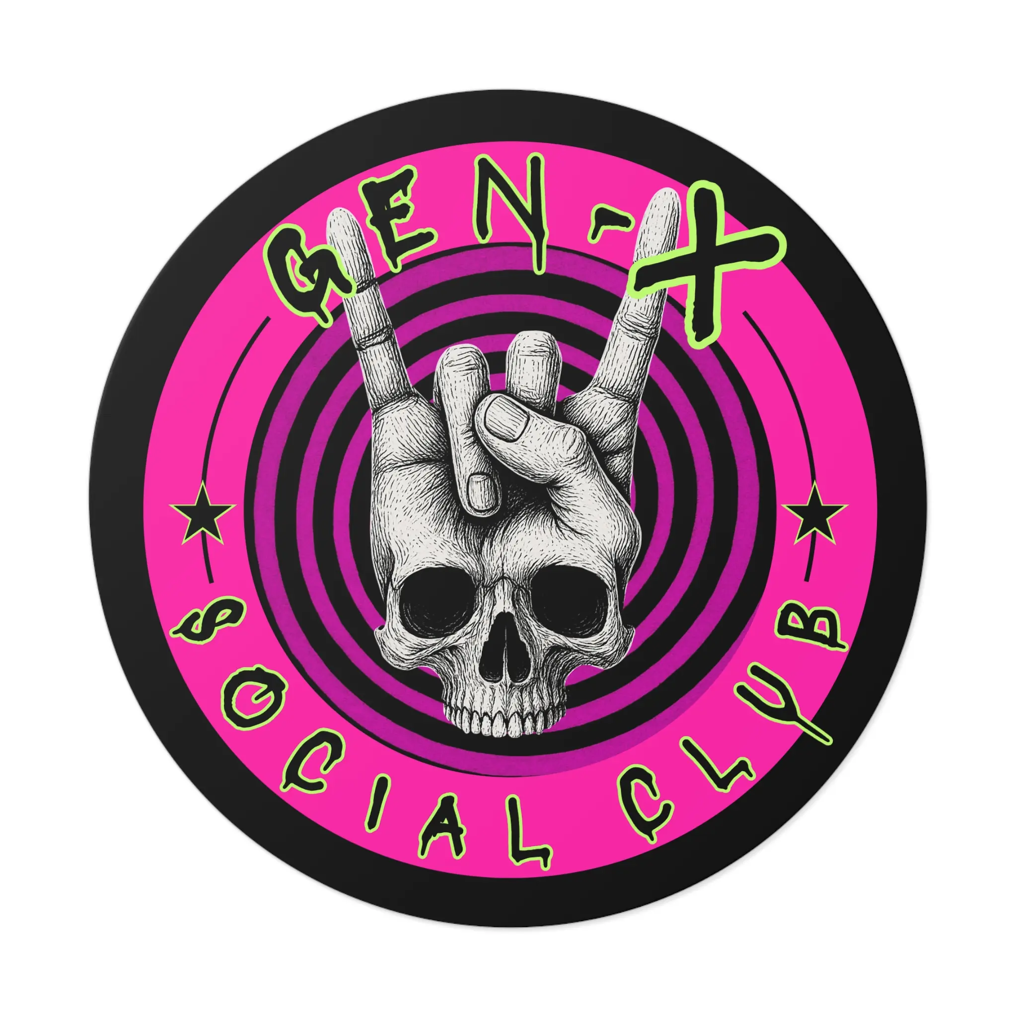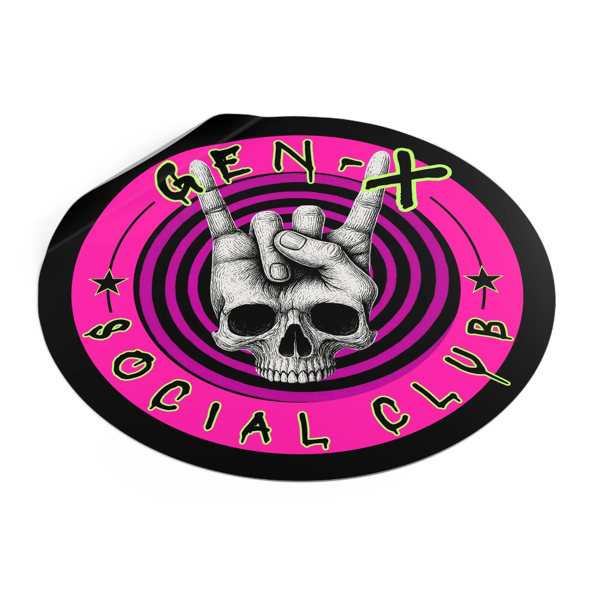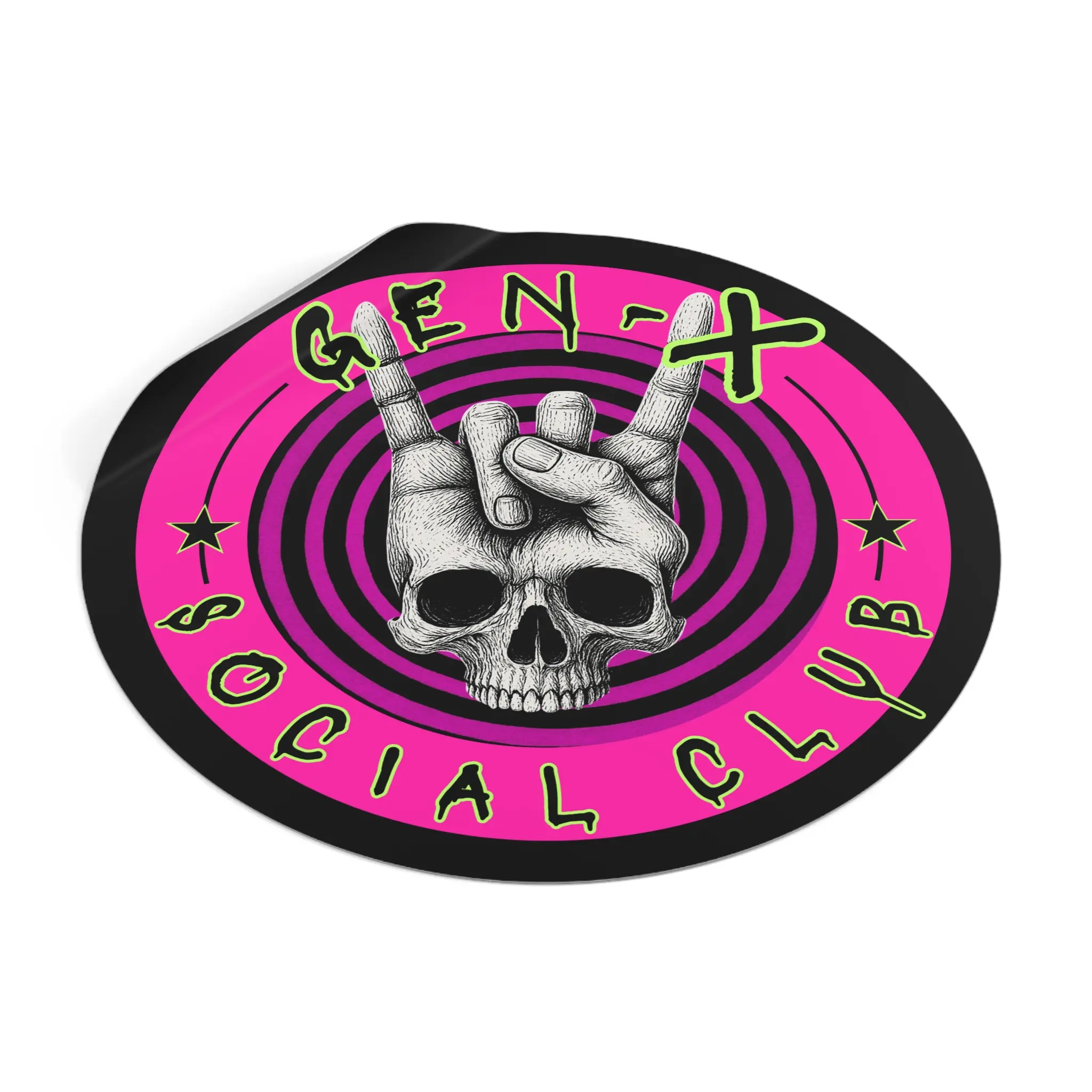 This round vinyl sticker brings bold attitude and lasting quality to whatever you stick it on. A hand-drawn skull throws up the classic rock 'horns' against hypnotic concentric rings and neon-punk pink, finished with gritty, graffiti-style lettering. The matte surface keeps glare low while the UV-protective laminate and premium waterproof vinyl stand up to sun and rain. Stick it on a laptop, guitar case, helmet, water bottle, or skate deck to add instant edge and personality to your everyday gear.