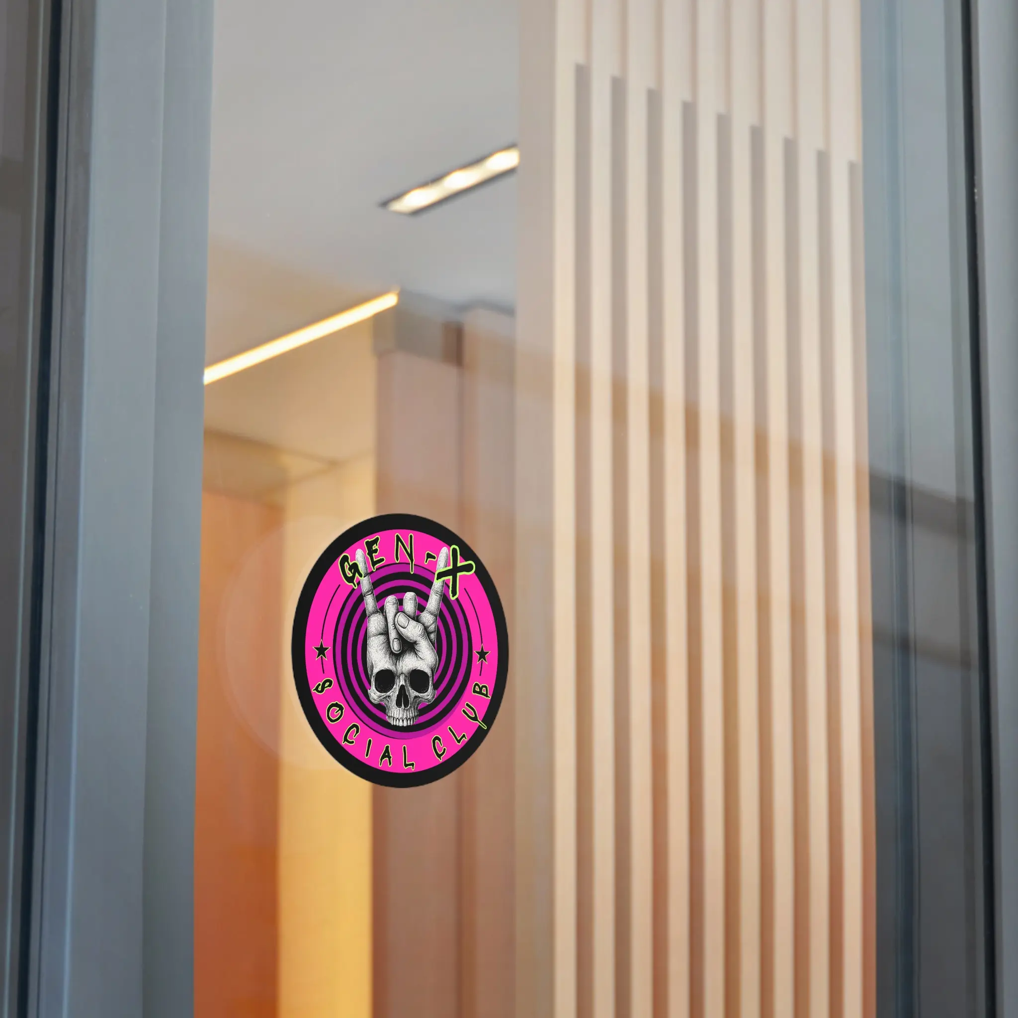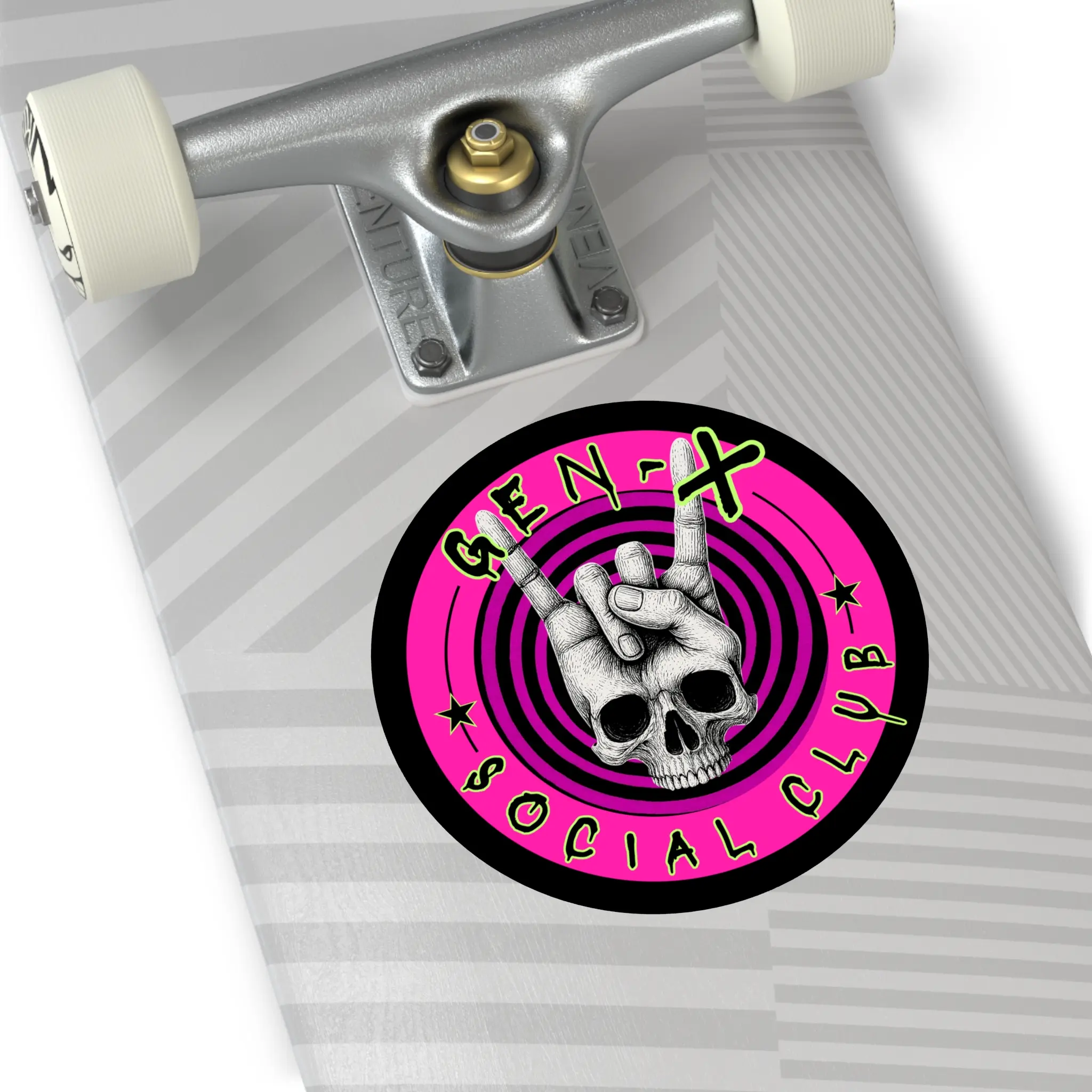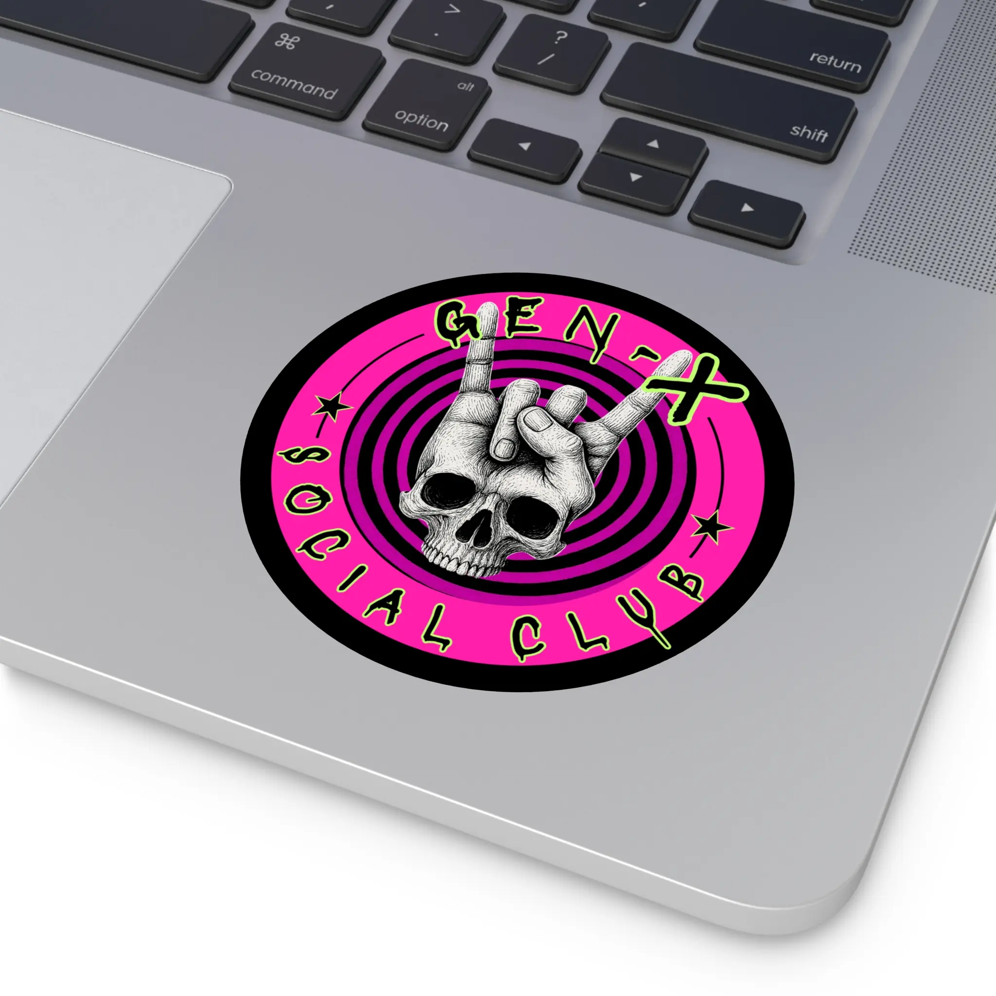 This round vinyl sticker brings bold attitude and lasting quality to whatever you stick it on. A hand-drawn skull throws up the classic rock 'horns' against hypnotic concentric rings and neon-punk pink, finished with gritty, graffiti-style lettering. The matte surface keeps glare low while the UV-protective laminate and premium waterproof vinyl stand up to sun and rain. Stick it on a laptop, guitar case, helmet, water bottle, or skate deck to add instant edge and personality to your everyday gear.