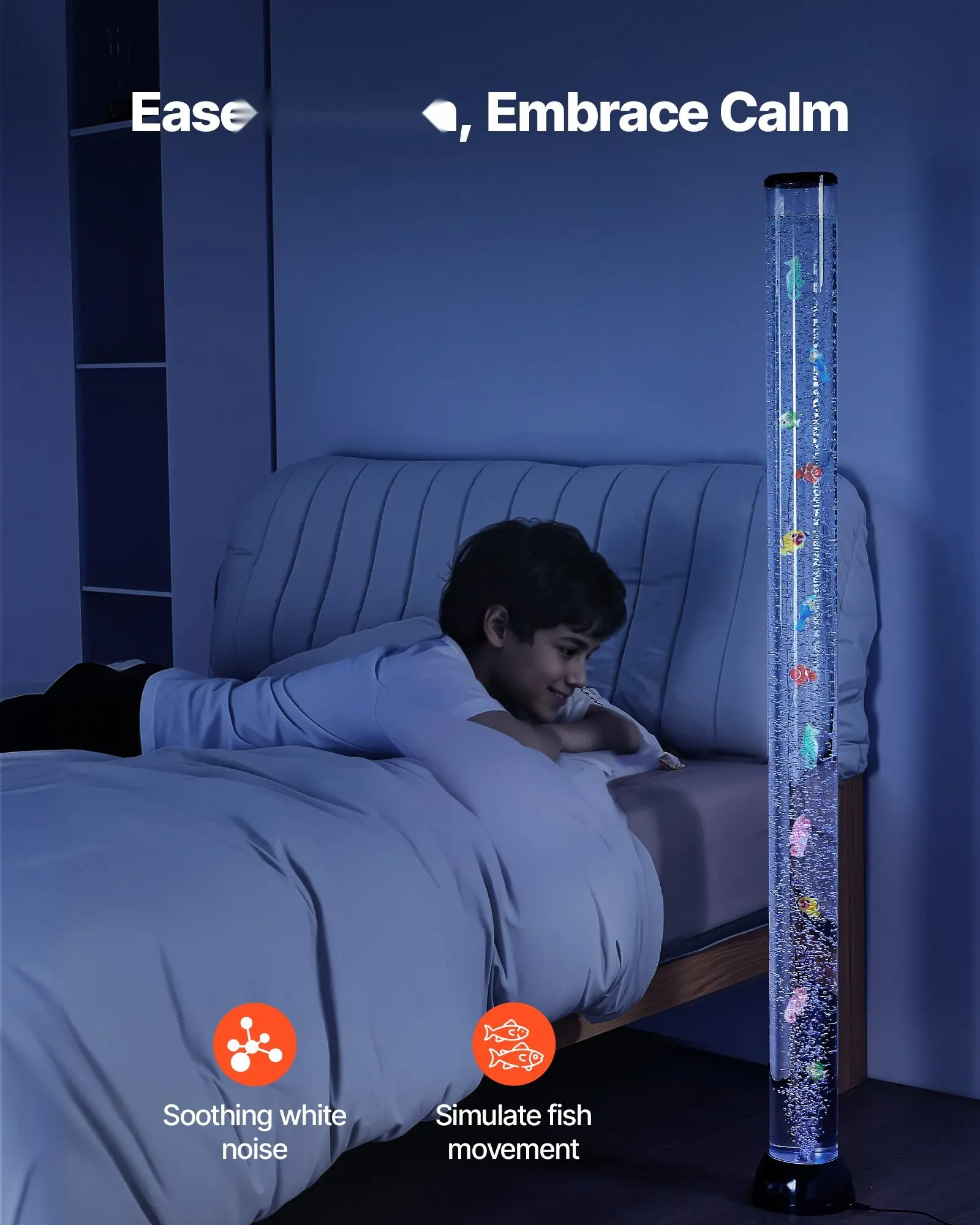 ·Floor-standing Bubble Lamp: This bubble lamp mimics underwater creatures' soothing movements, creating a calming ambiance with white noise. Ideal for those with autism, ADHD, or anxiety, it helps reduce stress and promote relaxation