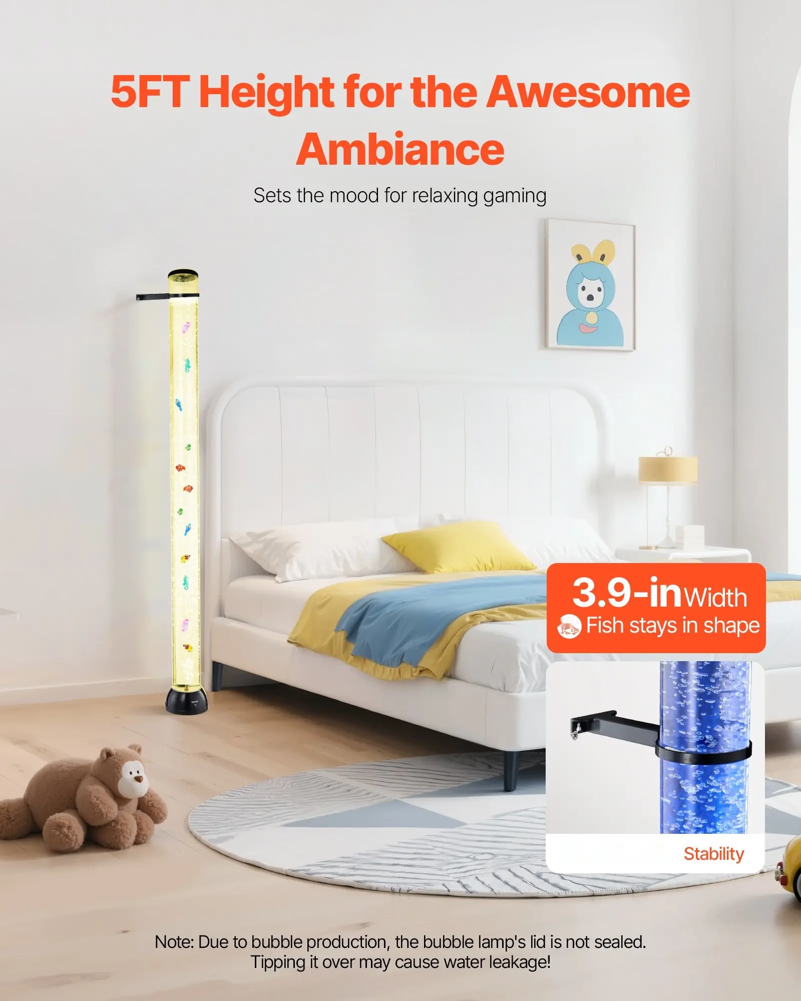 ·Anti-tip Design: Standing at 5 ft / 1510 mm tall, this bubble tube lamp is ideal for creating ambiance in any room. The widened tube walls avoid fish warping, enhancing their realism. A sturdy base ensures stability, keeping it secure