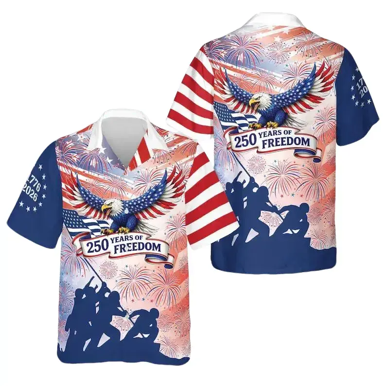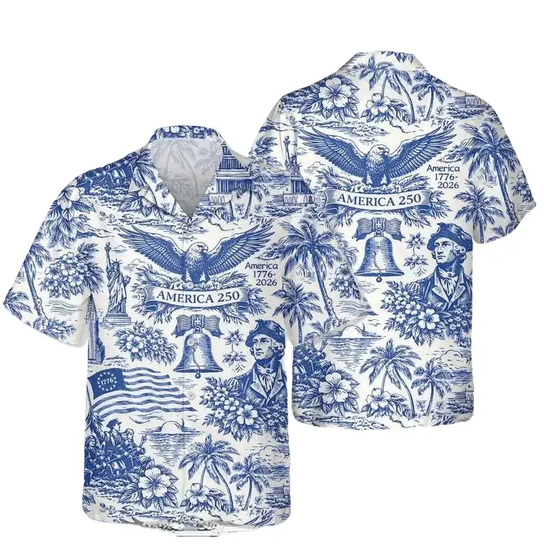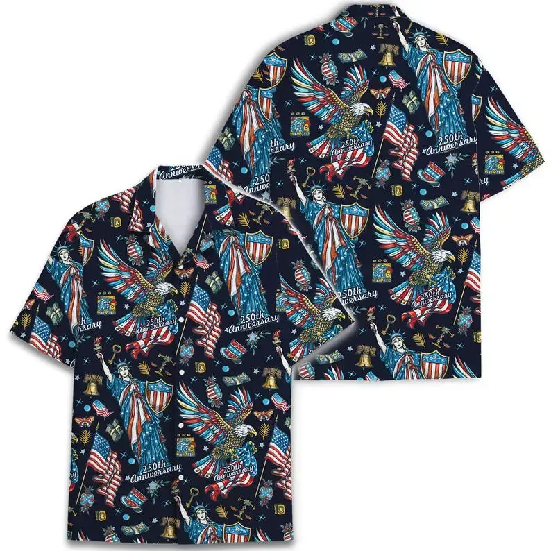 Full Print USA 250th Anniversary Hawaiian Shirt For Men, 250 Years of Freedom America Hawaiian Shirt, American Flag Fireworks Tropical Shirt, Vintage Summer Shirt, Beach Hawaiian Shirt, Gift for Men Women