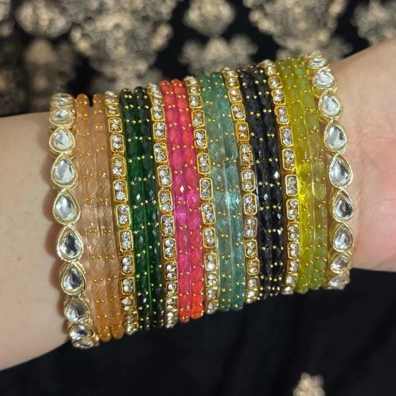 19 Pcs Raindrop Glass Bangle and Kundan Bangle Set