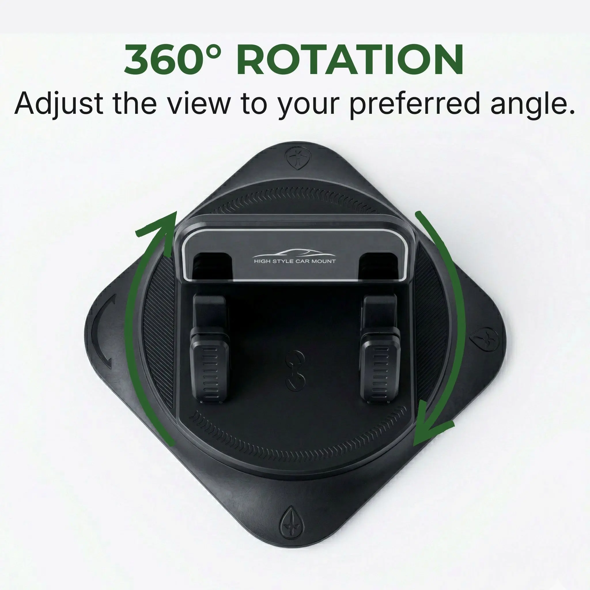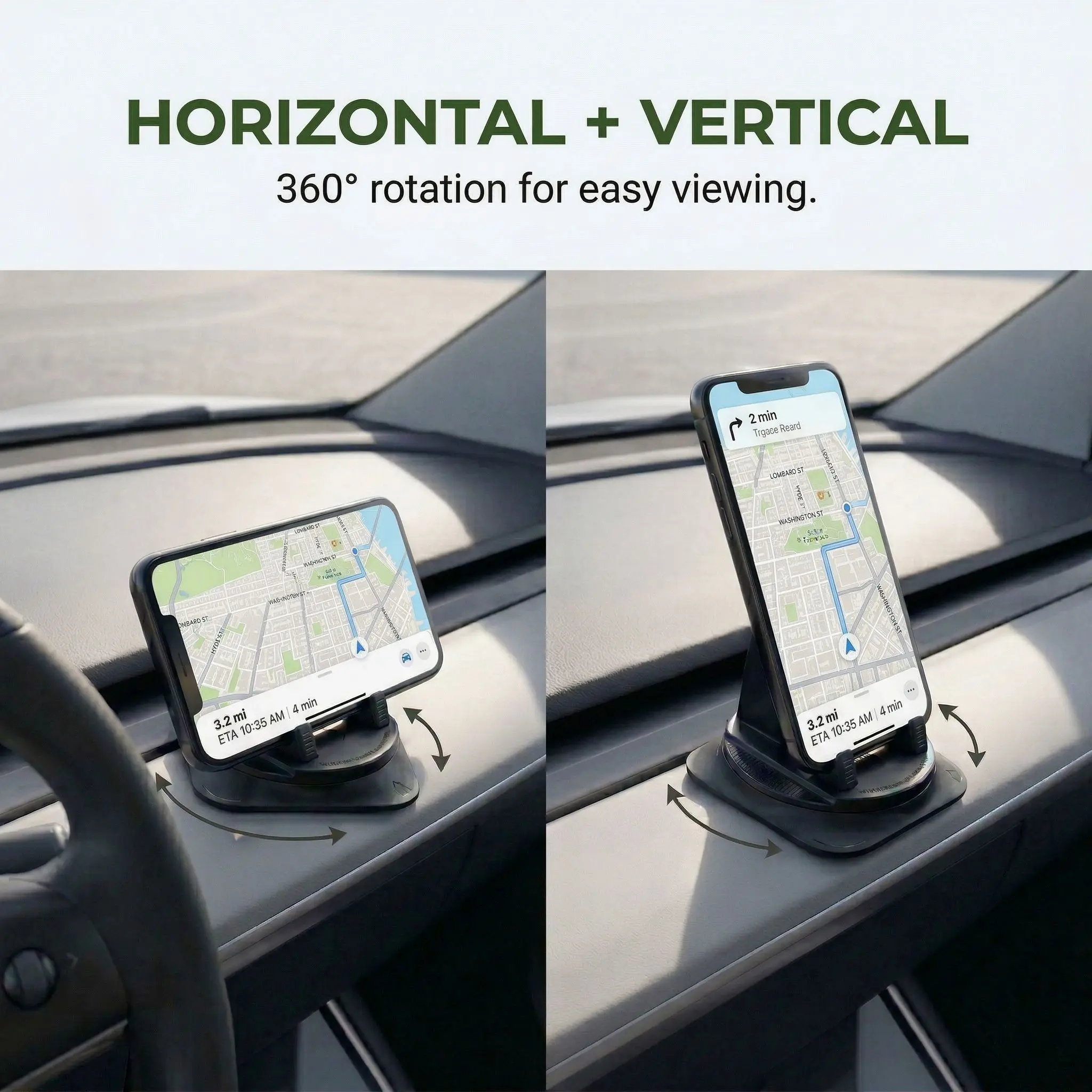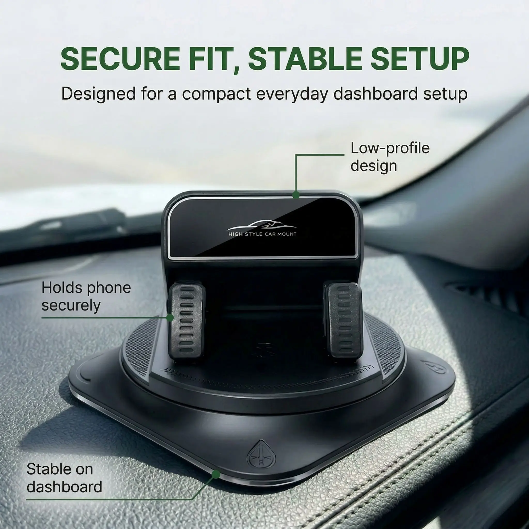 The mount rotates 360 degrees for both portrait and landscape viewing and adjusts with one hand for quick repositioning without fumbling. A low-profile footprint measuring approximately 3.85 by 2.51 inches sits neatly on the dashboard without taking up excess space.