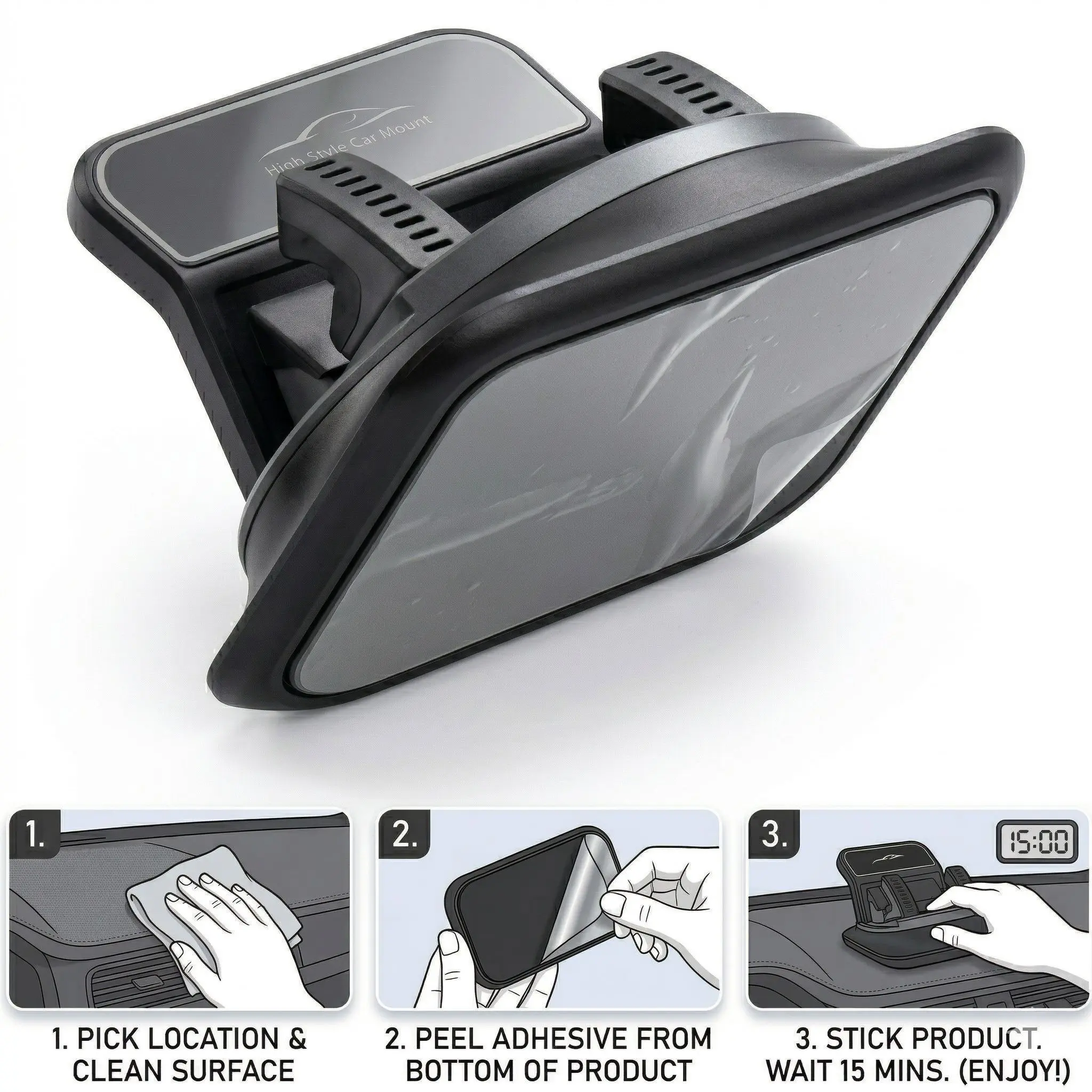 Setup is straightforward — clean the surface, peel the adhesive backing, stick, and wait 15 minutes before use. Designed to work with most smartphones on flat or gently curved dashboard surfaces.