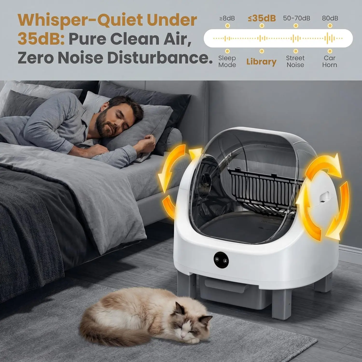 ·Quiet & Space-Saving Design: This self cleaning litter box Operates below 32dB—quieter than a whisper—for zero disturbance day or night. Compact size occupies just 0.24㎡. The quick-release mechanism enables 3-step disassembly, while the waterproof roller pad prevents messes. Compatible with all litter types and featuring a 3D filter to reduce waste. Suitable for cats 3-22 lbs.