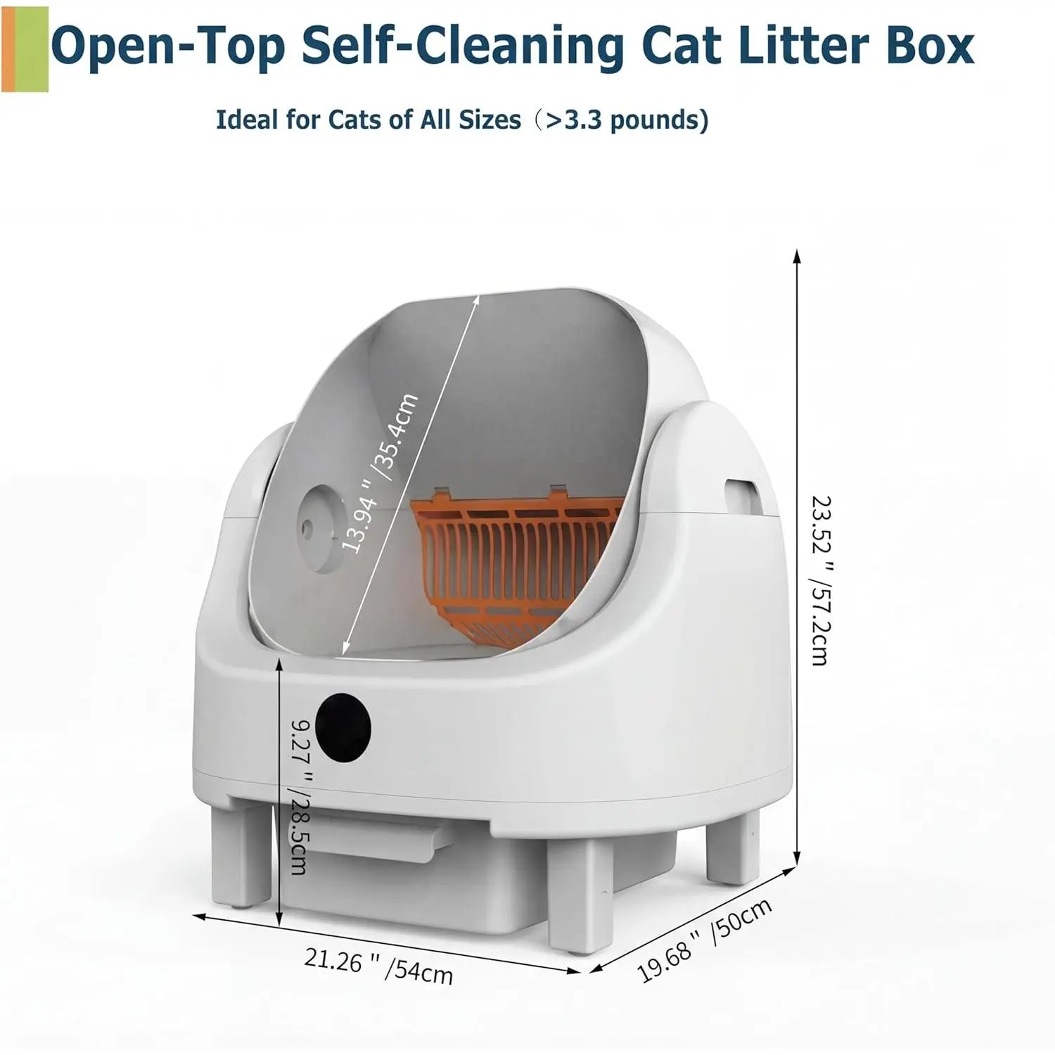 ·Hassle-Free Self-Cleaning System: The self-cleaning litter box automatically initiates a thorough clean cycle after each use. Its spacious open-top design (14.56" x 15.35" entrance) accommodates most cat sizes, including large breeds. Enhanced airflow reduces lingering odors, while the inviting layout aligns with your cat’s instincts for a comfortable transition.