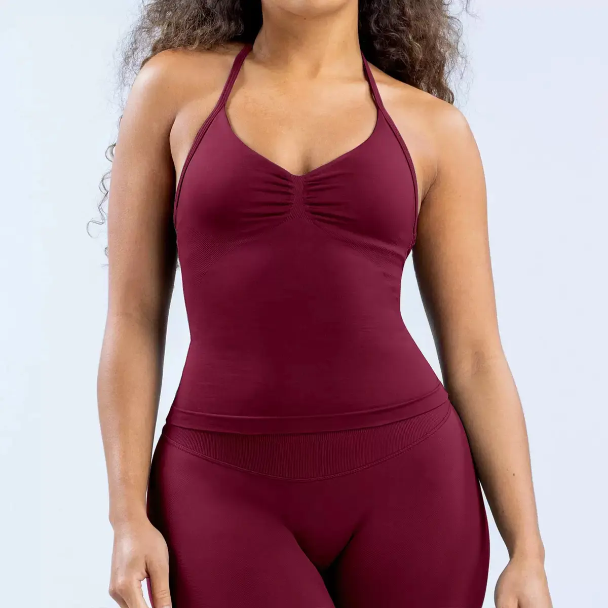 (With Logo) DFYNE 2 Piece Seamless Workout Outfit - Ruched Halter Sports Top & High Waist Activewear for Running & Gym Quick-Dry Compression Fitness Set