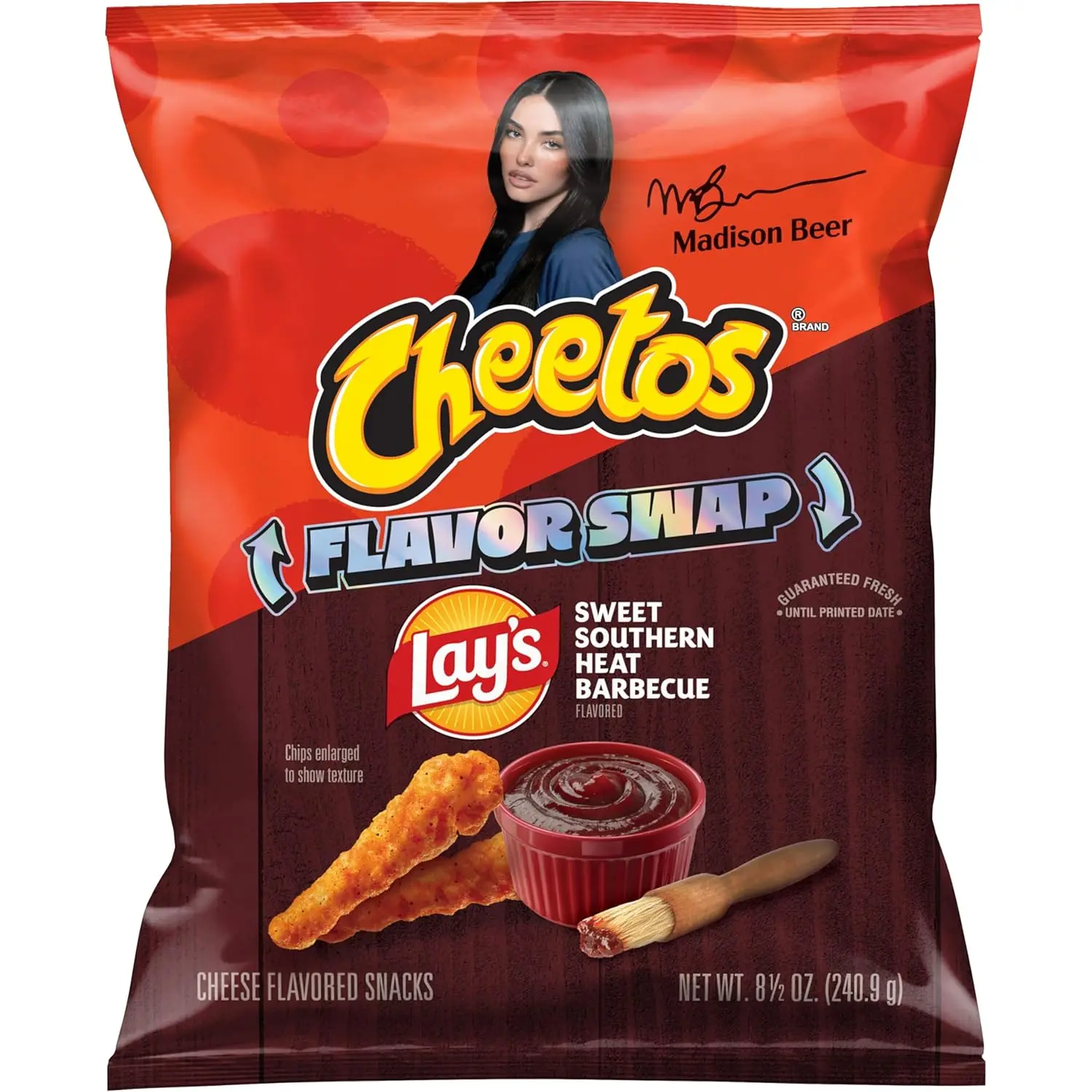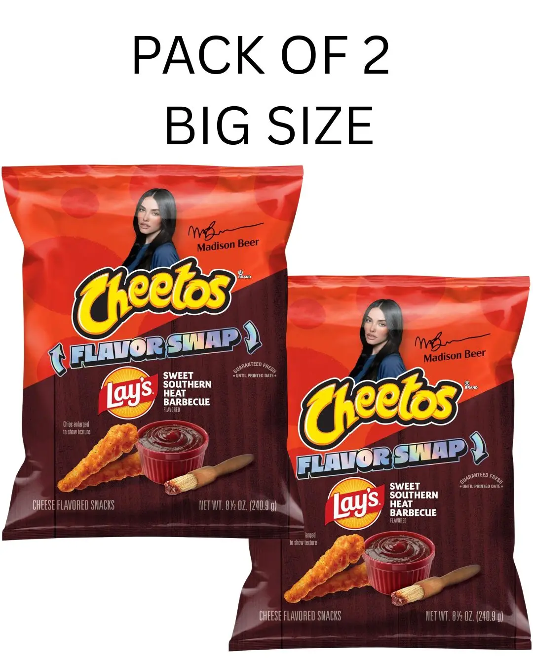 Pack of 2 - Big Size - Cheetos Cheese Flavored Snacks, Lay’s Flavor Swap Sweet Southern Heat BBQ, 8.5 oz Bag, snack, chip, corn, Madison Beer, corn chips