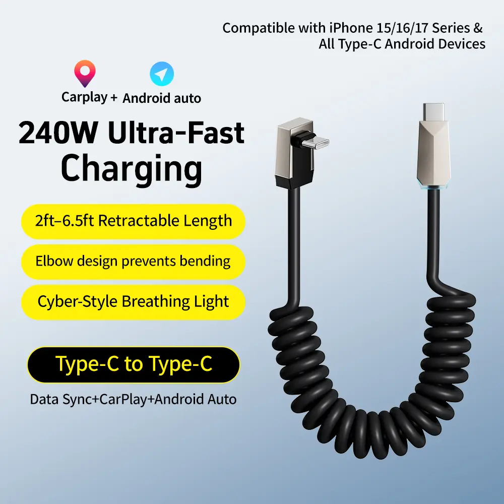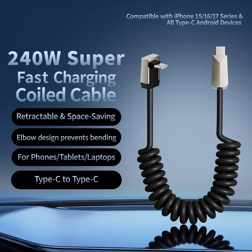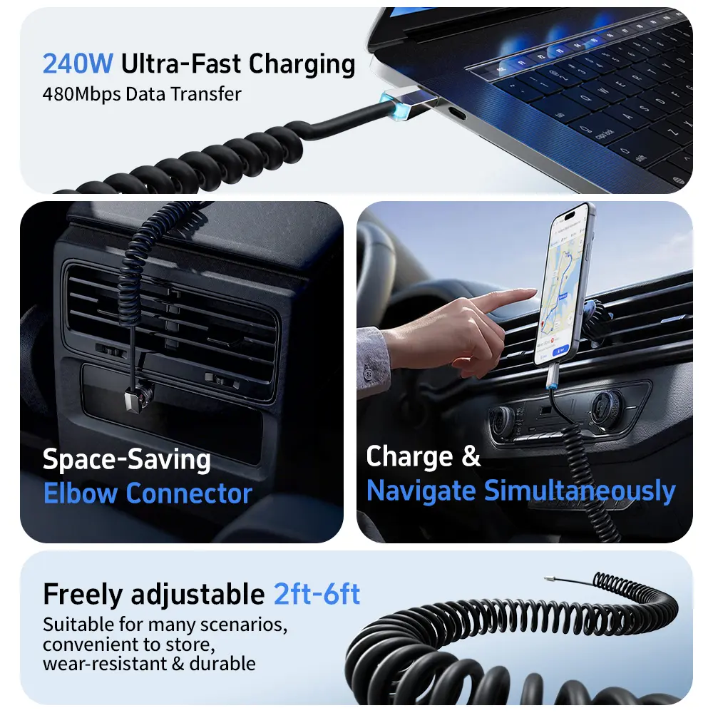90-degree elbow design and coiled spring cable structure: This cord offers a comfortable stretch range of 2 to 6 feet—extending up to a maximum of 6.6 feet. It is highly convenient to use and incredibly compact for storage, making it ideal for a wide variety of settings, including in-car use, business travel, and home office environments.