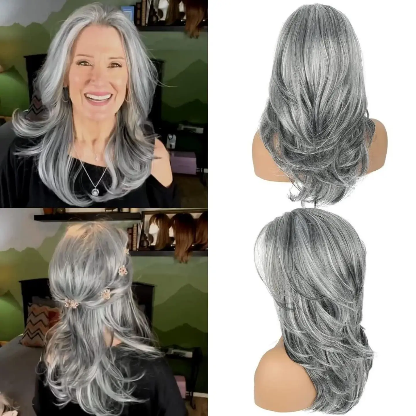 The silver-gray color adds a modern touch to any outfit. The layered design enhances the wig's natural look, making it suitable for various occasions. The wavy texture adds volume and movement, giving a lifelike appearance.