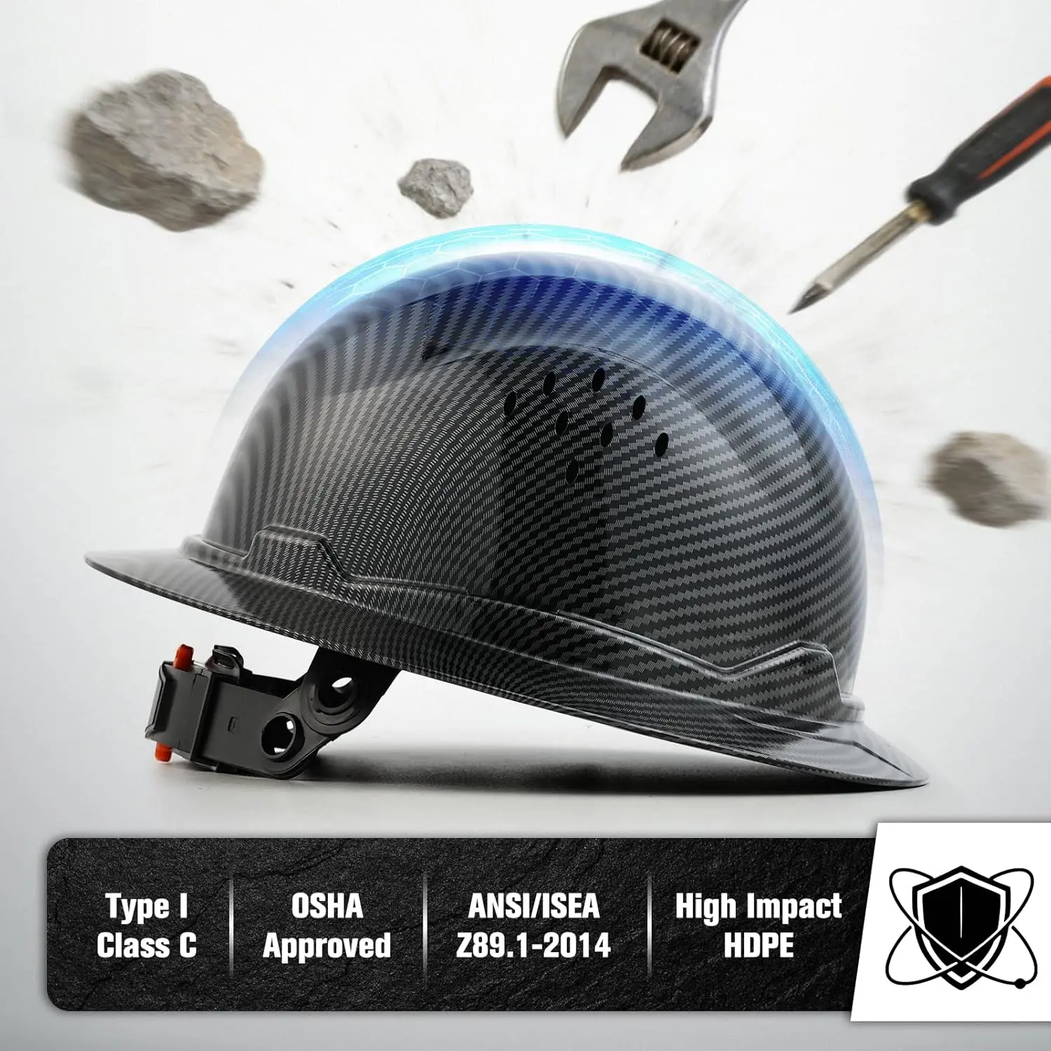 ⚙️ 2.6-Point Adjustable Suspension– Ratchet knob fits head sizes from 6.5 to 8 inches.Easy to adjust even with work gloves on.Includes moisture-wicking padded sweatband to minimize neck fatigue.