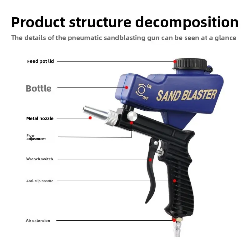 Small pneumatic sandblasting gun, portable gravity sandblaster, high-pressure tool kit, electric accessories and hardware, handheld sandblaster—portable home metal cleaning and restoration tools