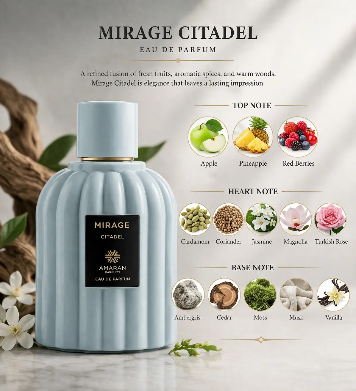 MIRAGE CITADEL UNISEX EDP by AMARAN EXCLUSIVE features a complex fragrance profile. The top notes of apple, pineapple, and red berries provide a vibrant opening. At the heart, cardamom, coriander, jasmine, and Turkish rose create a floral-spice balance. The base combines ambergris, cedar, and vanilla, delivering depth and longevity. This blend offers a versatile scent suitable for various occasions.