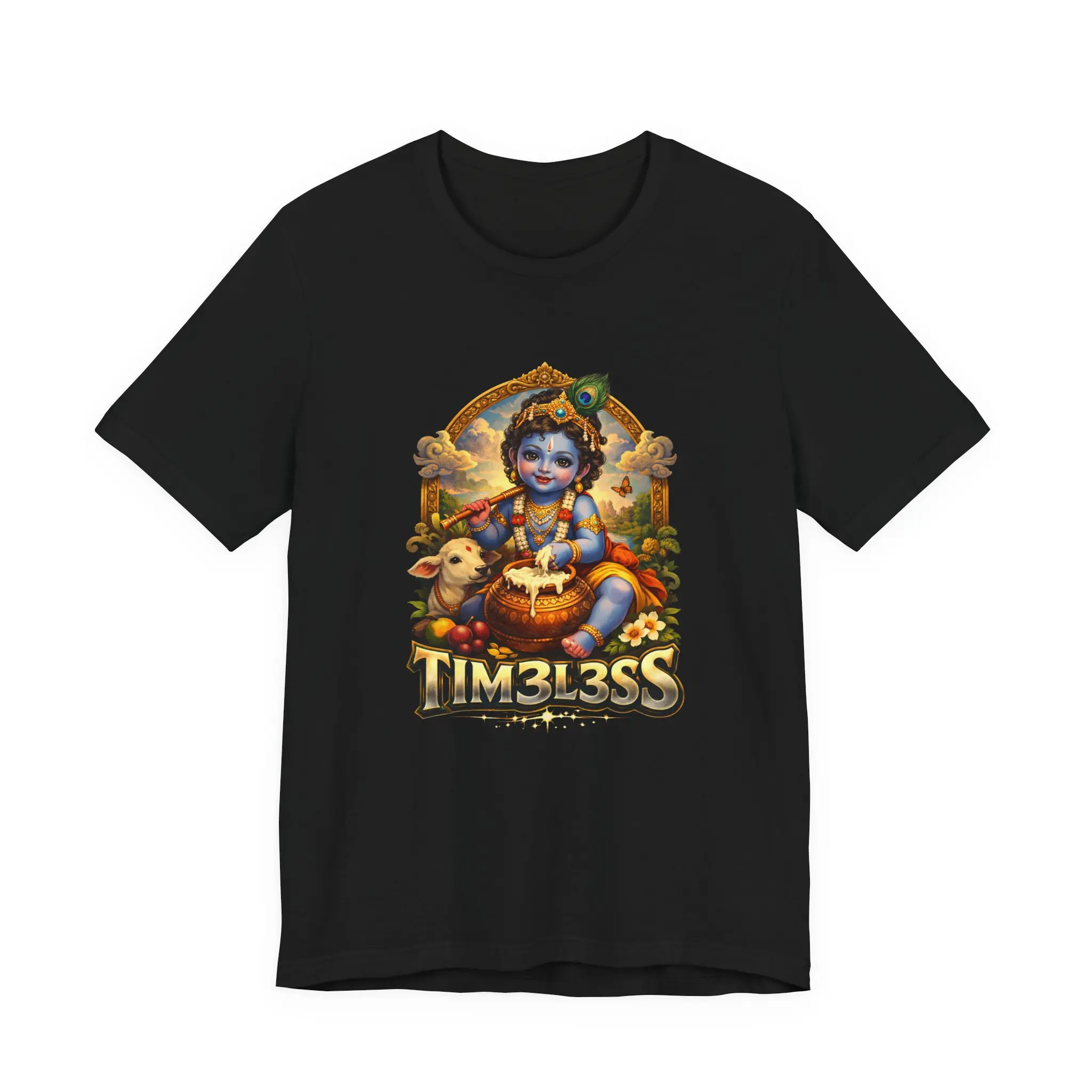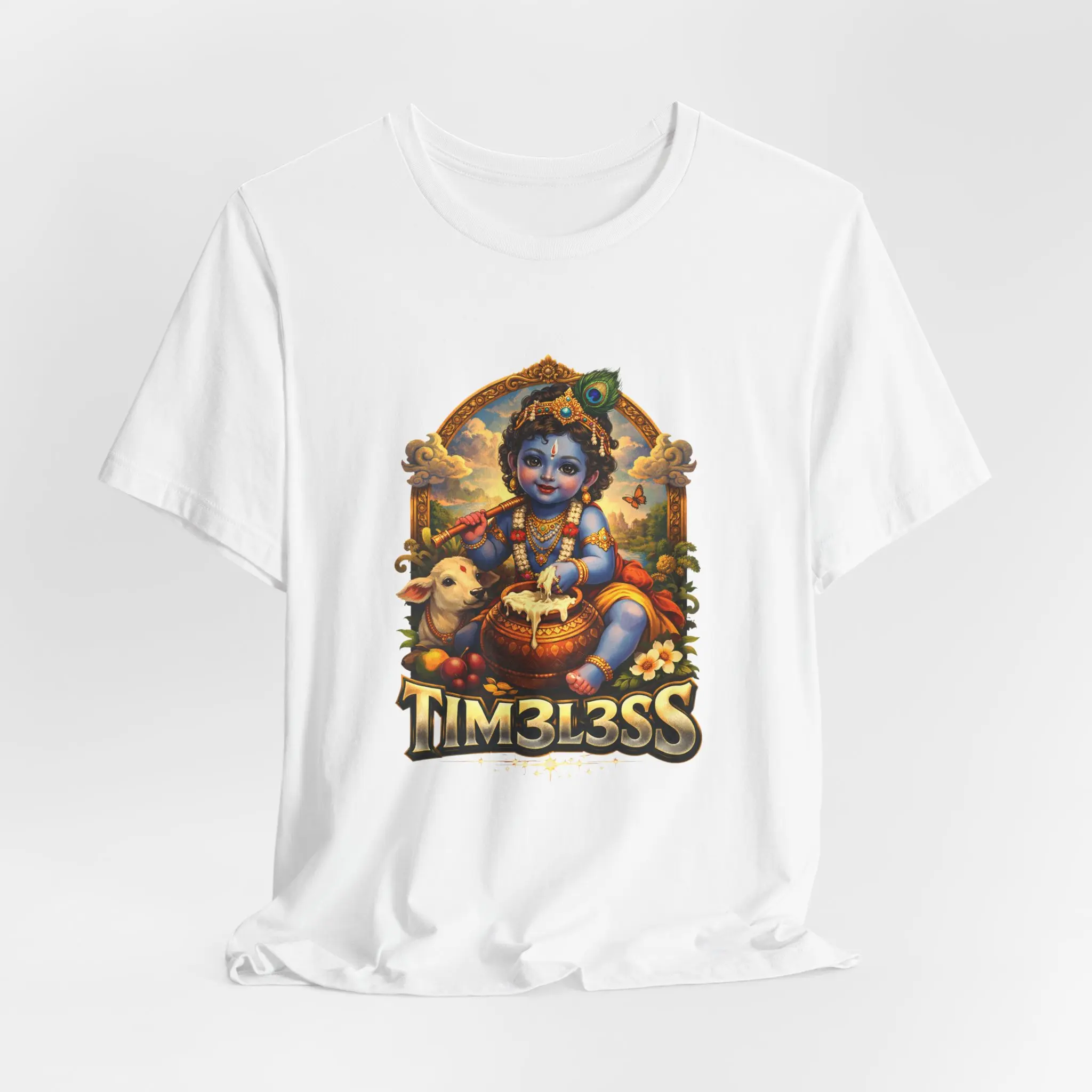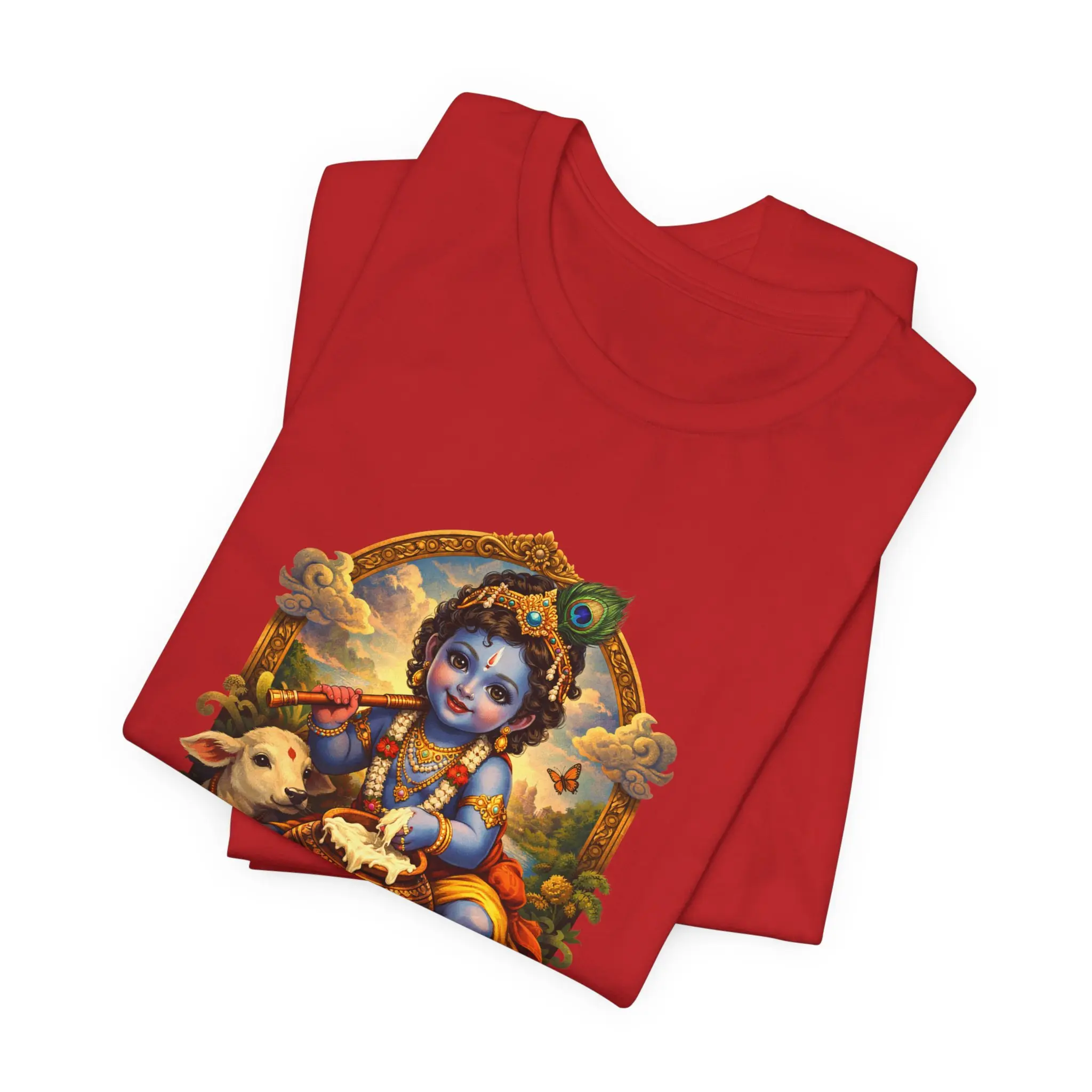 Soft, simple, and quietly devotional — this tee brings baby Krishna into your everyday rhythm. The lightweight Bella+Canvas fabric drapes easily, keeping the image gentle against the body while the ribbed crew neck and side seams hold a neat silhouette. Wear it to morning practice, to a community kirtan, or while reading under a tree; the design feels like a small, calming reminder rather than a statement. Breathable cotton keeps you comfortable during warm afternoons, and the tear-away label prevents irritation while you move and stretch. It’s made with attention to ethical sourcing and finished with crisp, durable printing so the motif stays clear through washes. A calm, wearable piece for people who live with devotional quiet and subtle style.