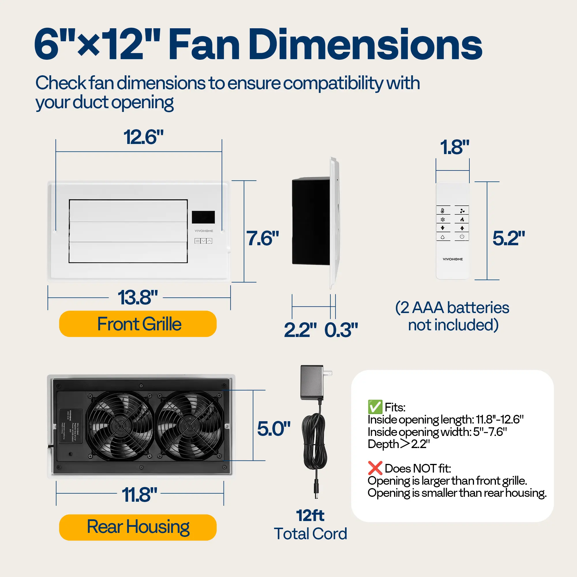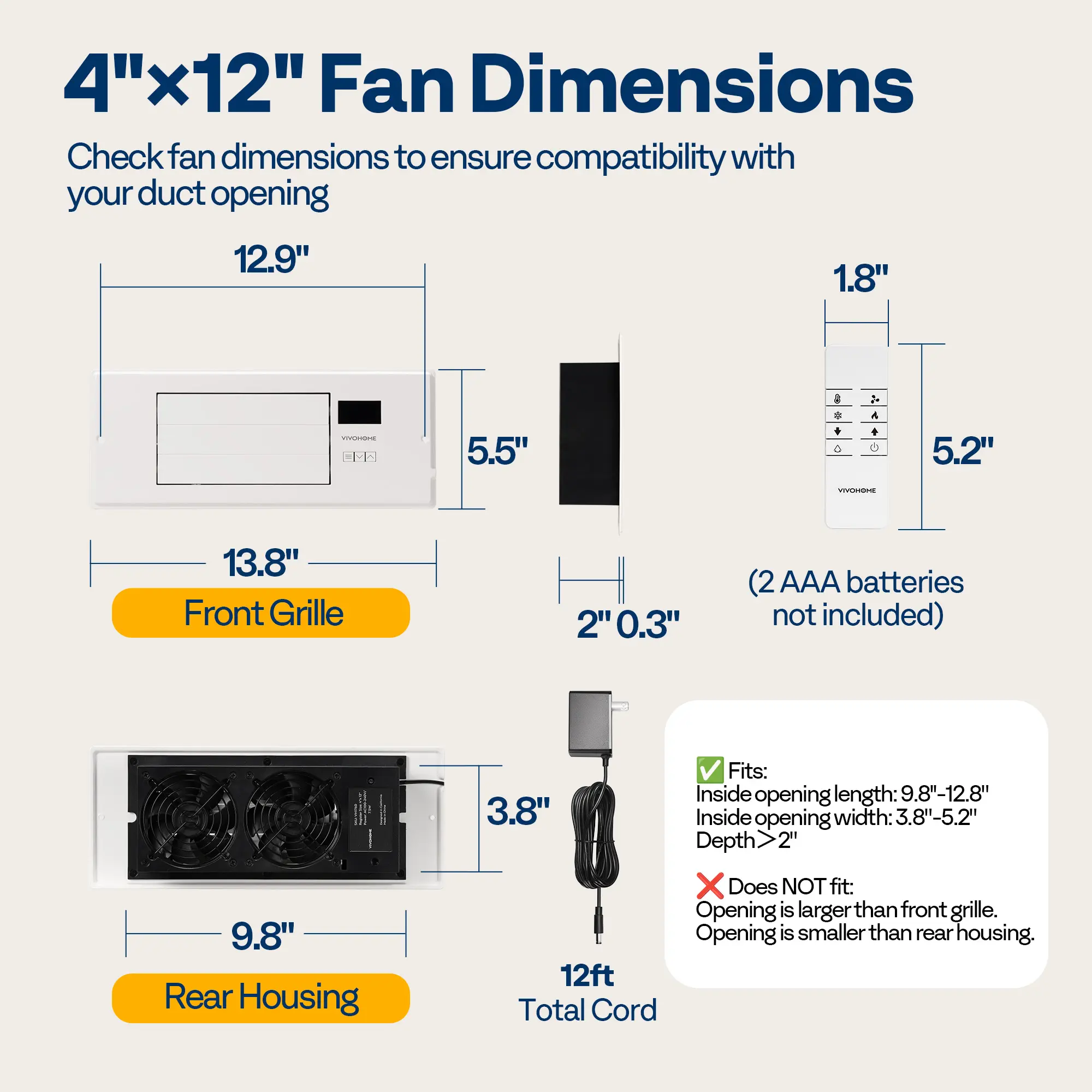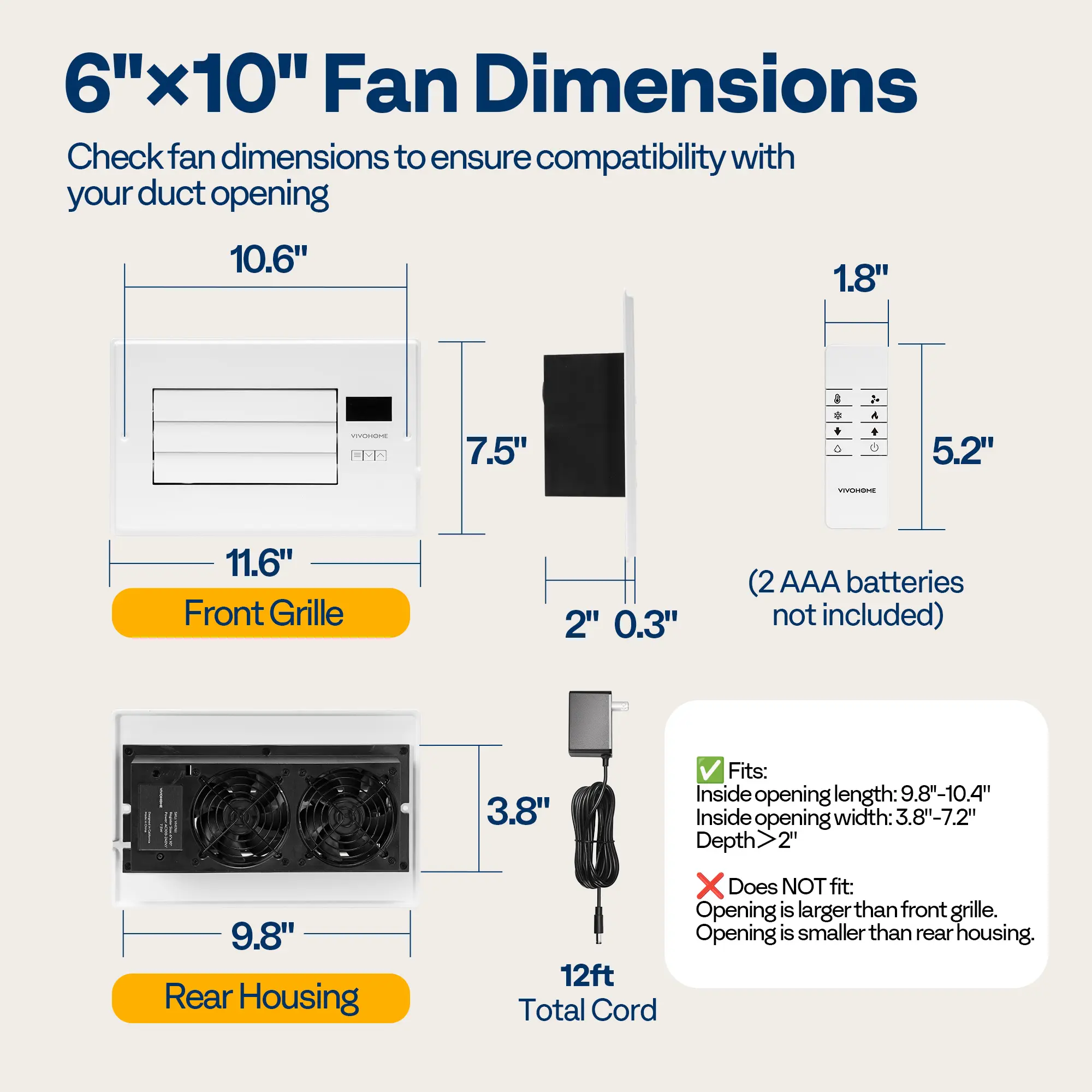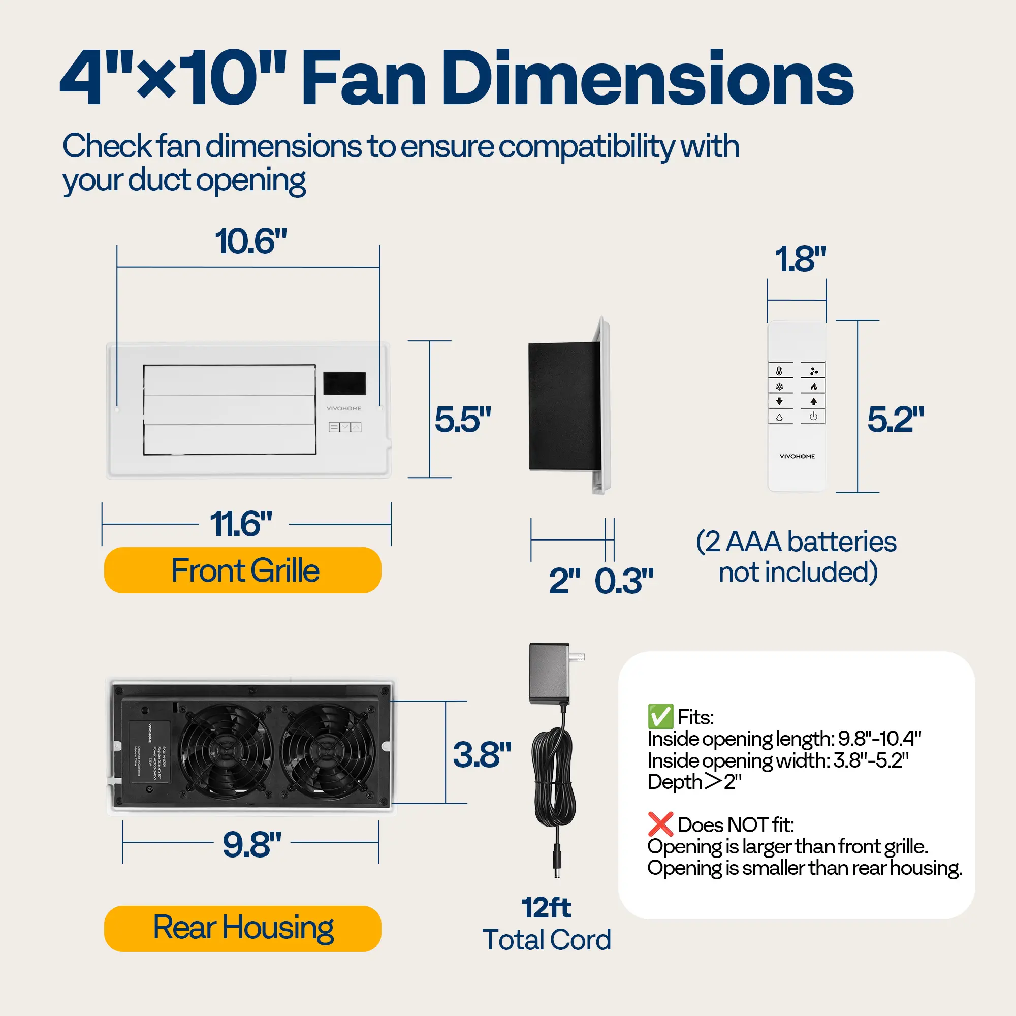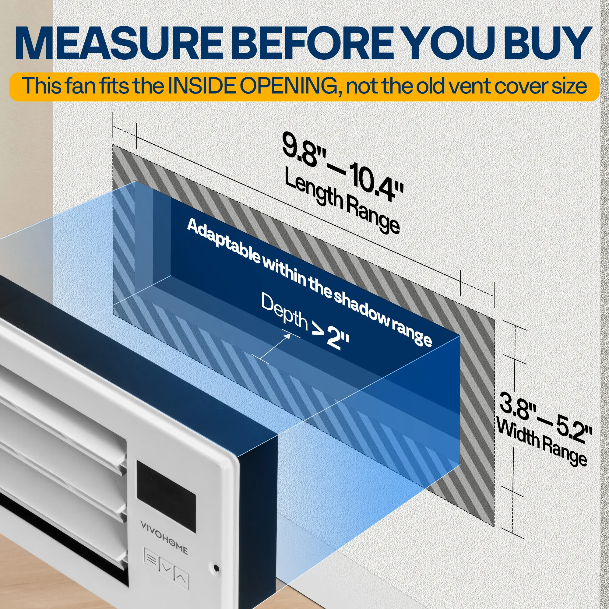 ·SIZE 4×10 INCH: Compatible with vent sizes ranging from 9⁷⁄₈"−10⁵⁄₈" in length, 3⁷⁄₈″−5¹⁄₂″ in width, and more than 2'' in depth; Measure vent openings before purchasing; This household booster fan is easy to install on floors, walls, or ceiling