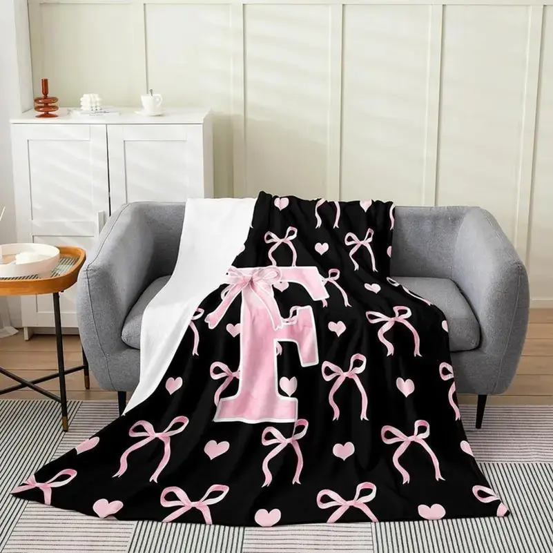 Alphabet A–Z print flannel throw blanket for teen girls, black/pink monogram flannel blanket, personalized gifts for daughter, women, ladies, custom blanket for bedding, bedroom, office