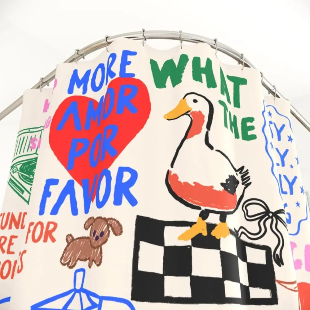 Hand Drawn Doodle Shower Curtain Brunch Shower Curtain Unique Bathroom Decor Housewarming Coffee Pastry Breakfast Goose Egg Strawberry Peach