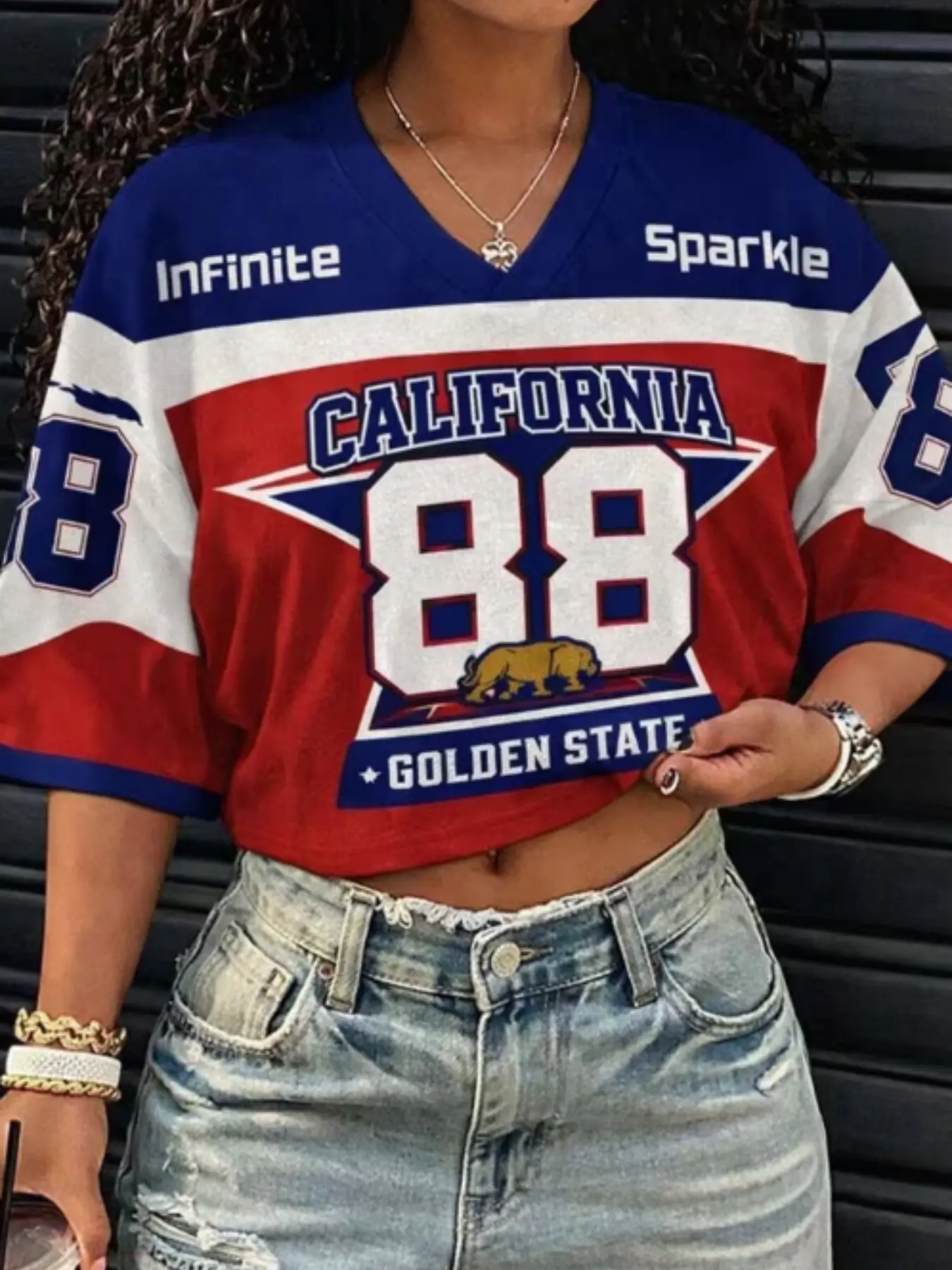 5. Y2K California Golden State 88 Short Sleeve Jersey, Blue Color, Loose Fit V Neck, Blokecore Street Style Women's T-Shirt