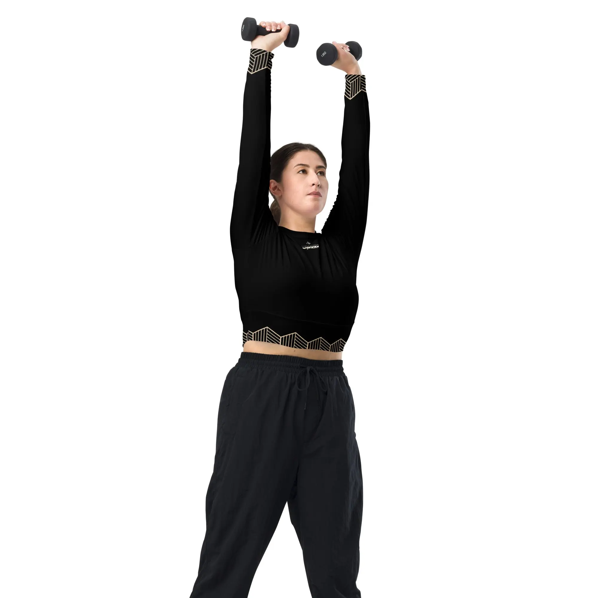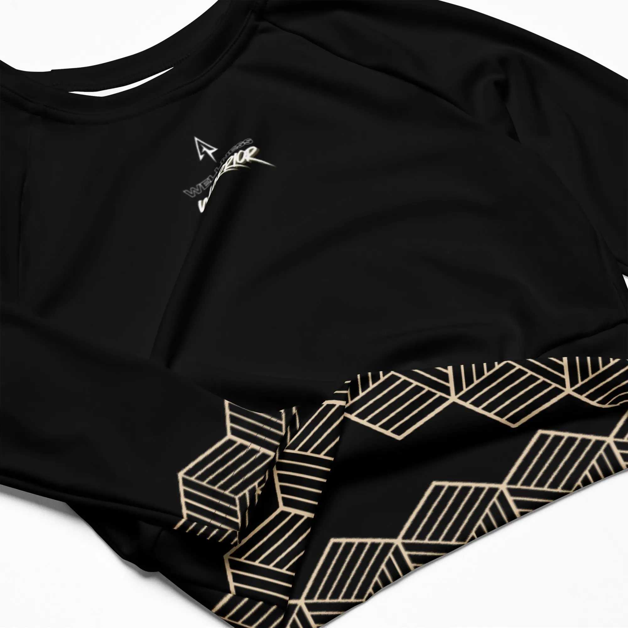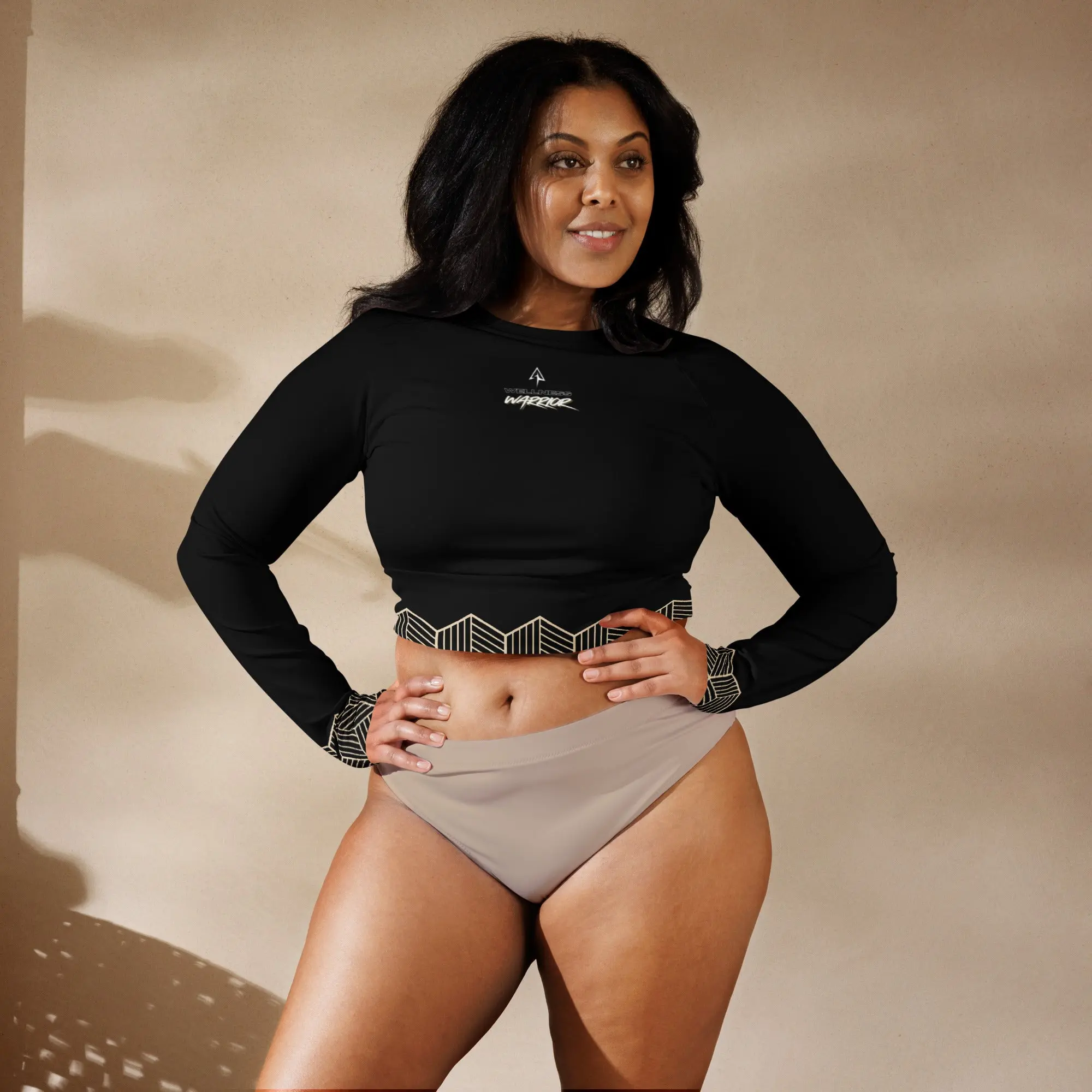 This long-sleeve crop top is made of recycled polyester and elastane, making it an eco-friendly choice for swimming, sports, or athleisure outfits. The crop top has a tear-away care label and a wide, double-layered waistline band for a comfortable fit.