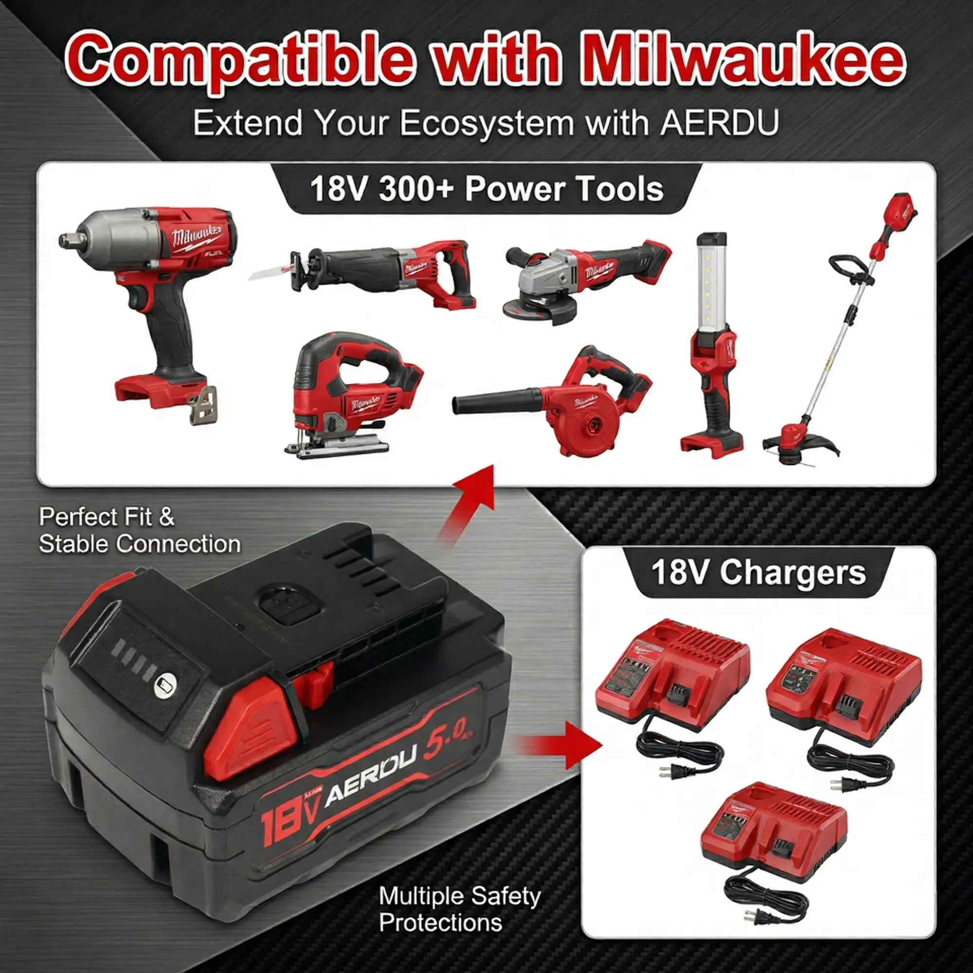 A perfect drop-in replacement. 100% compatible with all Milwaukee 18V cordless power tools and original chargers. Works flawlessly as a replacement for OEM battery models including 48-11-1850, 48-11-1840, 48-11-1828, 48-11-1820, and 48-11-1815. Snaps in securely and charges fast just like the original.